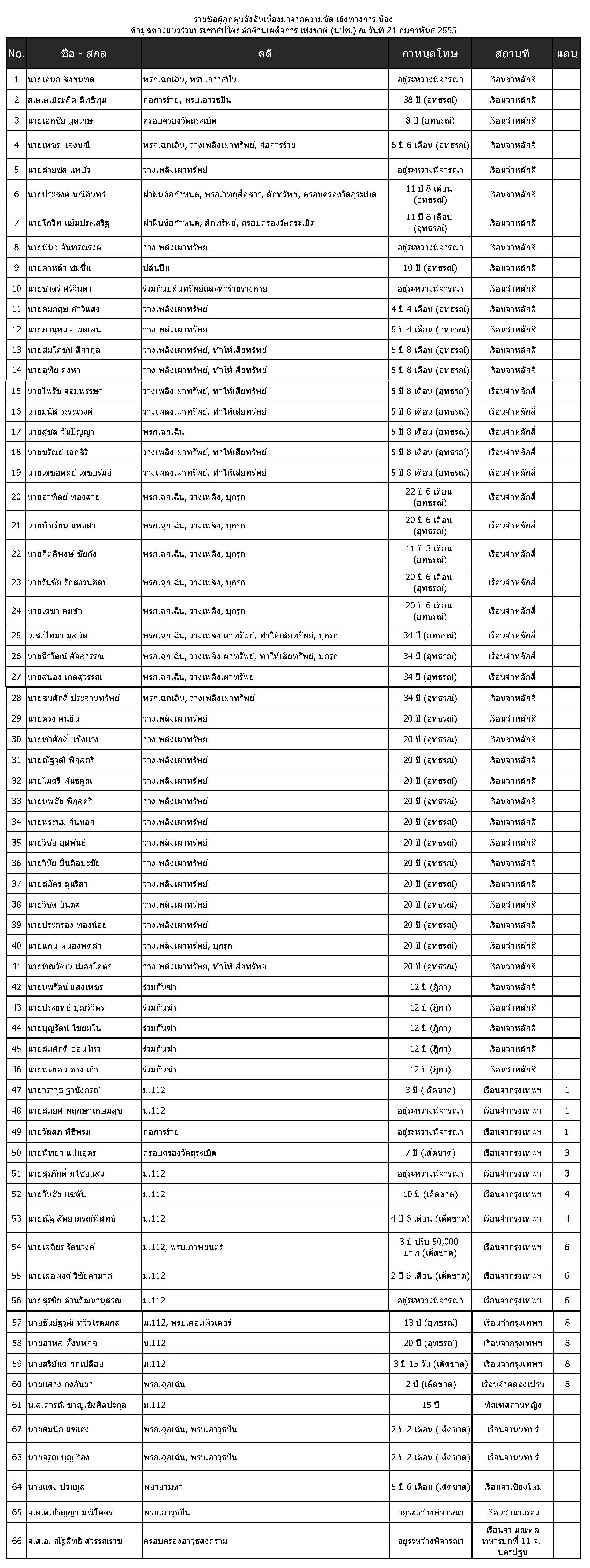 คนเสื้อแดงที่อยู่ในเรือนจำไม่ได้รับการประกันตัวเหมือนแกนนำ แยกเป็นคดีความผิดกลุ่มต่างๆ ดังนี้ คือ กลุ่มคดีผิดประมวลกฎหมายอาญามาตรา112 , คดีพรก.ฉุกเฉิน , คดีก่อการร้าย, คดีครอบครองอาวุธวัตถุระเบิด ครอบครองอาวุธสงคราม พรบ.อาวุธปืน คดีวางเพลิงเผาทรัพย์ , คดีร่วมกันฆ่า , คดีลักทรัพย์