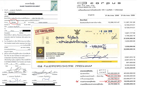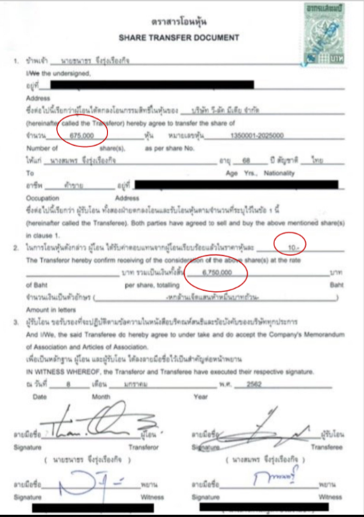 3.1. ทำตราสารโอนหุ้นแล้ว หุ้นของนายธนาธร 675,000 หุ้น ผู้โอนได้รับเงิน 6,750,000 บาทจากมารดา ที่ราคาหุ้นละ 10 บาท