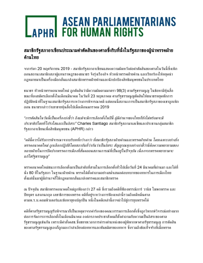 หมายเหตุ สำนักข่าวอิศรา www.isranews.org เมื่อวันที่ 20 พ.ย. 2562 สมาชิกรัฐสภาอาเซียนเพื่อสิทธิมนุษยชน (Asean Parliamentarians for Human Rights : APHR) ออกแถลงการประณามคำตัดสินของศาลรัฐธรรมนูญไทย กรณีศาลรัฐธรรมนูญ วินิจฉัยให้สมาชิกภาพ ส.ส. ของนายธนาธร สิ้นสุดลง
