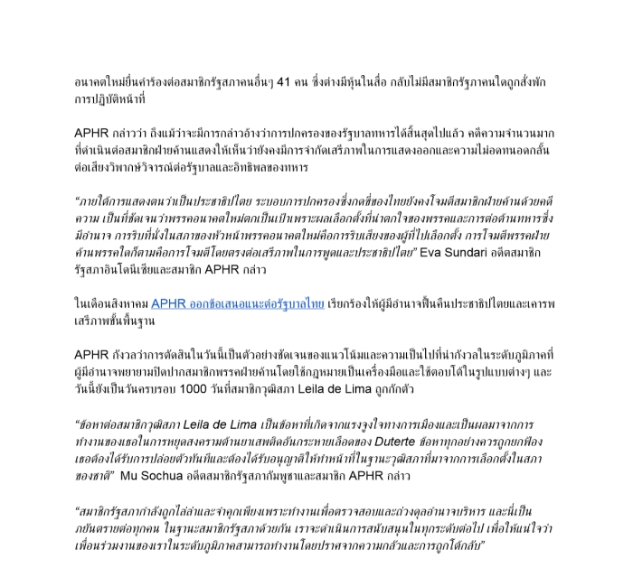 ในเดือน ส.ค. APHR ออกข้อเสนอแนะต่อรัฐบาลไทย เรียกร้องให้ผู้มีอำนาจผื้นคืนประชาธิปไตยและเคารพเสรีภาพขั้นพื้นฐาน