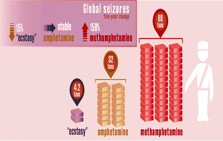 1 กราฟฟิกแสดงการแพร่ระบาดของสารเสพติดกลุ่ม ATS จากรายงานของสำนักงานป้องกันยาเสพติดและปราบปรามอาชญากรรมแห่งสหประชาชาติ หรือ ยูเอ็นโอดีซี