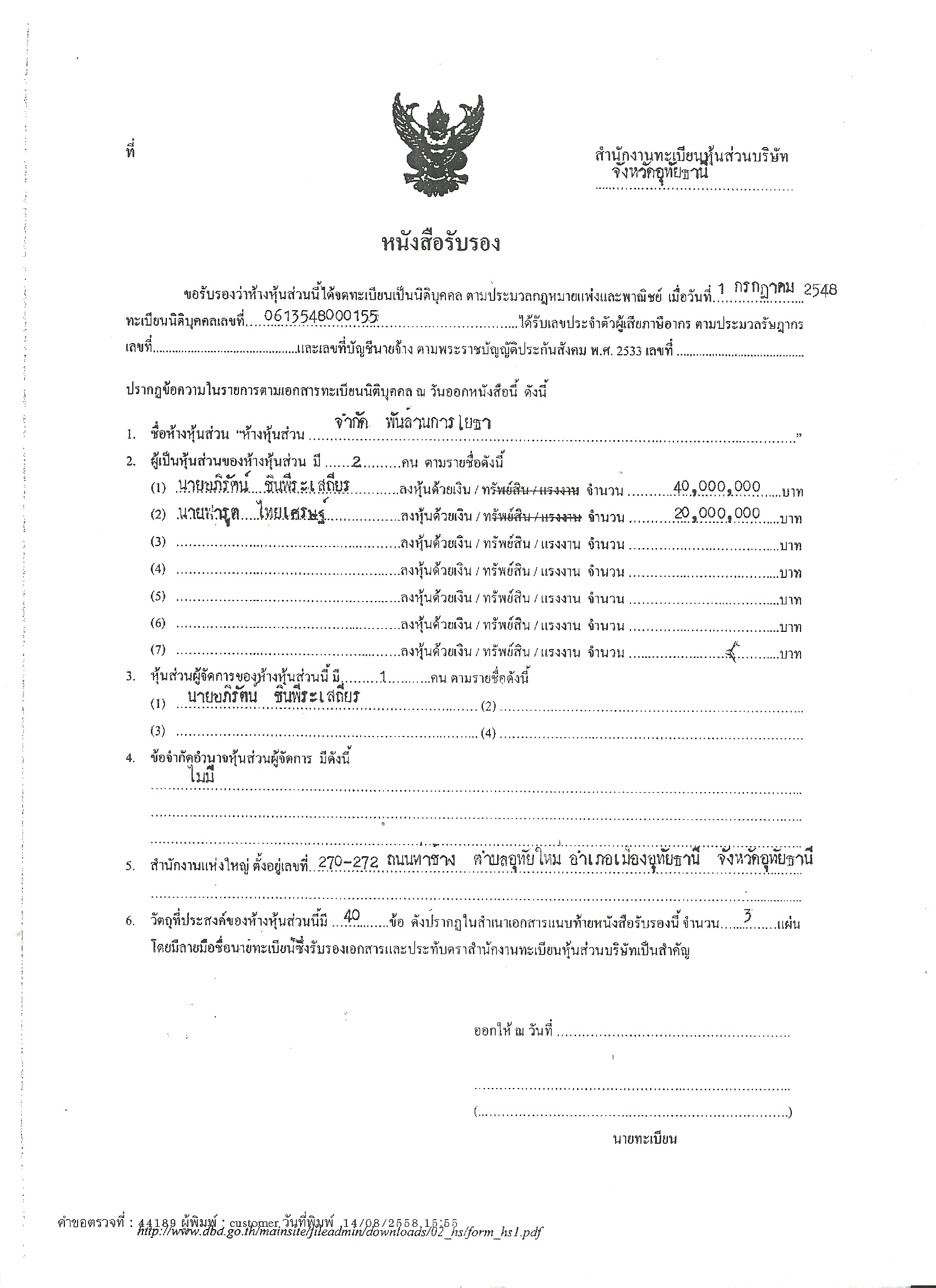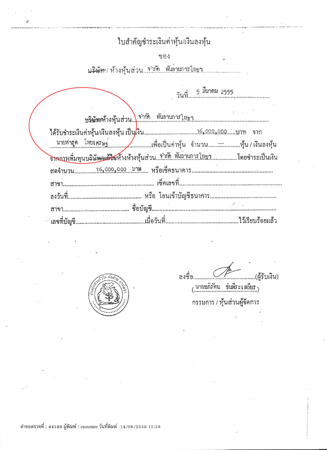 7 ก.ค.53 หจก.พันล้านการโยธา จดทะเบียนเพิ่มทุนอีก 9.5 ล้านบาท เป็น 10 ล้านบาท มีหุ้นส่วน 2 คนคือ