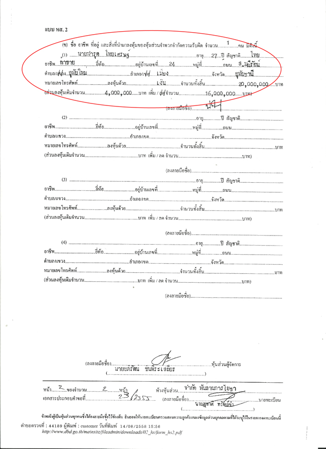 2.นายฟารุต ไทยเศรษฐ์ อายุ 25 ปี อยู่บ้านเลขที่ 24 ถ.มณีรัตน์ ต.อุทัยใหม่ อ.เมืองอุทัยธานี จ.อุทัยธานี ลงหุ้นด้วยเงิน 4 ล้านบาท