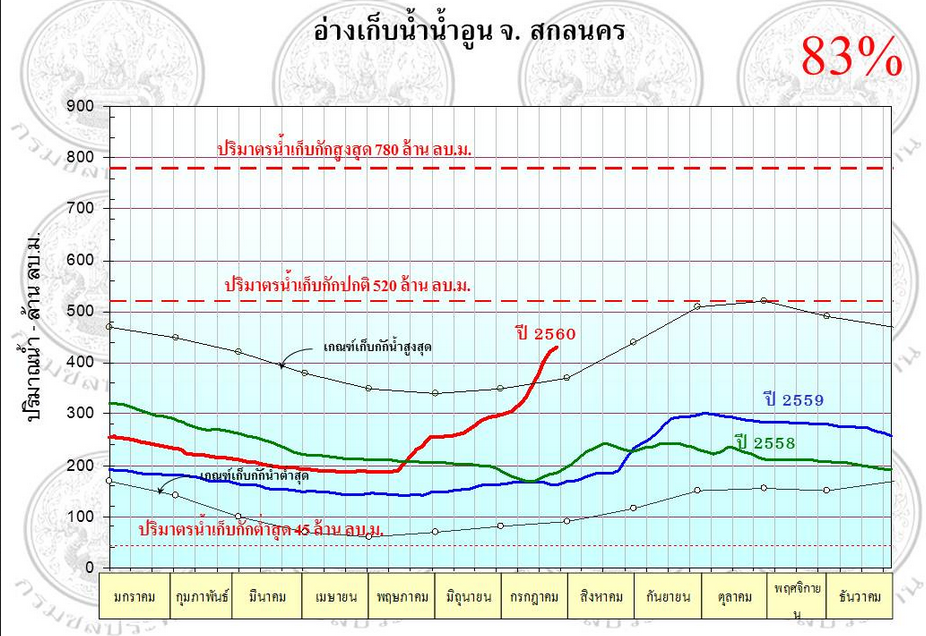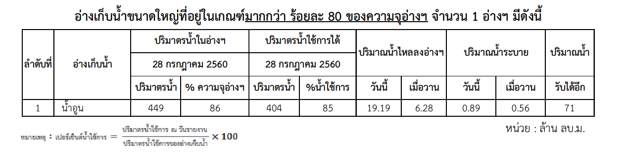 ขณะที่อ่างเก็บน้ำขนาดใหญ่ที่น้ำอยู่ในเกณฑ์มากกว่า 80% ของความจุอ่าง คือ อ่างเก็บน้ำน้ำอูน จังหวัดสกลนคร
