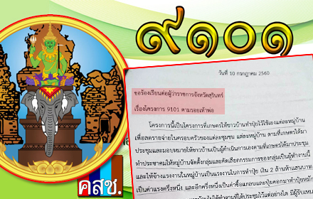 สำนักข่าวอิศรา www.isranews.org รายงานว่า เมื่อเร็วๆ นี้ ชาวบ้าน อ.ศรีขรภูมิ จ.สุรินทร์ ได้ส่งหนังสือร้องเรียนเกี่ยวกับการบริหารงานของเจ้าหน้าที่ใน 'โครงการ 9101 ตามรอยเท้าพ่อ' ของกระทรวงเกษตรและสหกรณ์ว่า ได้ให้ผู้รับเหมามาประมูลงาน แล้วจัดหาอุปกรณ์มาให้ชาวบ้าน ทั้งที่ ยังไม่มีการประชุมวางแผน หรือรับสมัครคนทำงาน