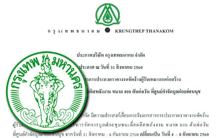 ประกาศดังกล่าว กำหนดให้ผู้ที่สนใจเข้าร่วมประกวดราคา สามารถติดต่อขอรับเอกสารประกวดราคาได้ที่บริษัท กรุงเทพธนาคม จำกัด ตั้งแต่วันที่ 31 ส.ค.-6 ก.ย. 2560 และกำหนดการยื่นประกวดราคาในวันที่ 8 ก.ย. 2560 (ดูเอกสาร 1)