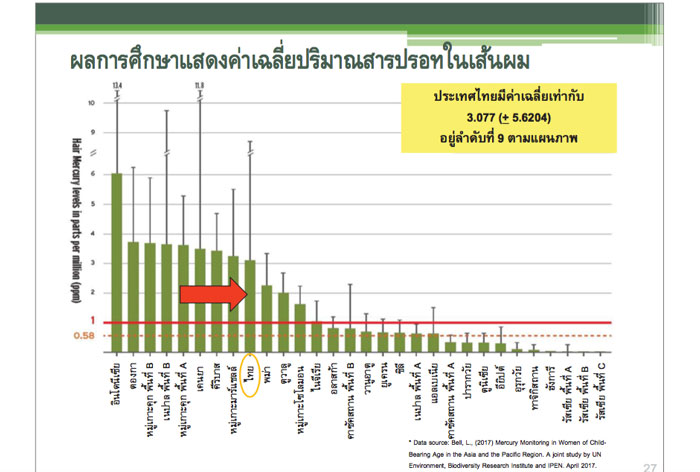 น.ส.อัฏฐพร กล่าวอีกว่า จากจำนวนกลุ่มตัวอย่างของไทย 74% มีอัตราสารปรอทในเส้นผมในระดับเกิน 1 ppm ซึ่งเป็นระดับที่ส่งผลกระทบด้านระบบประสาทและผลกระทบต่อไตและหัวใจ