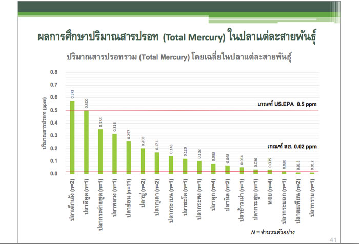 และผลการศึกษาจากตัวอย่างทั้งหมด 39 ตัวอย่าง แบ่งเป็น ปลาทะเลจำนวน 14 ตัวอย่างมีปริมาณสารปรอทเกินเกณฑ์ฯ (0.5ppm)จำนวน2ตัวอย่าง และปลาน้ำจืด25ตัวอย่างเกินเกณฑ์ฯ (0.02ppm)จำนวน18ตัวอย่าง