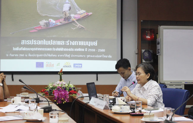 18 ก.ย. 2560 ที่ห้องประชุมสถาบันวิจัยสังคม อาคารวิศิษฐ์ ประจวบเหมาะ จุฬาลงกรณ์มหาวิทยาลัย มูลนิธิบูรณะนิเวศ ร่วมกับ Arnika Association จัดแถลงข่าวนำเสนอผลการศึกษา เรื่อง “สารปรอทในปลาและร่างกายมนุษย์ ในพื้นที่พัฒนาอุตสาหกรรมและโรงไฟฟ้าของประเทศไทย ปี 2559 – 2560”