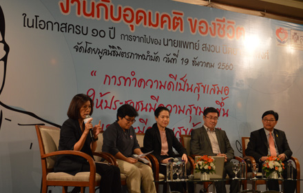 วันที่ 19 ธ.ค. 2560 มูลนิธิมิตรภาพบำบัด จัดงาน ‘งานกับอุดมคติของชีวิต’ ในโอกาสครบ 10 ปี การจากไปของ นพ.สงวน นิตยารัมภ์พงศ์ โดยมีการเสวนา หัวข้อ สานฝัน สร้างหลักประกันสุขภาพเพื่อประชาชนถ้วนหน้า ณ โรงแรม มิราเคิล แกรนด์ คอนเวชั่น กรุงเทพฯ