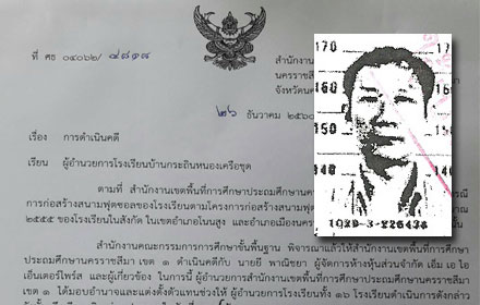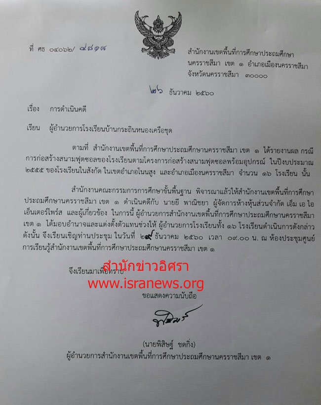 สำนักข่าวอิศรา ตรวจสอบพบว่า เมื่อเร็วๆ นี้ นายพิสิษฐ์ ชดกิ่ง ผู้อำนวยการสำนักงานเขตพื้นที่การศึกษาประถมศึกษานครราชสีมา เขต 1 ได้ทำหนังสือแจ้งให้ผู้อำนวยการโรงเรียนในสังกัดเขตอำเภอโนนสูง และอำเภอเมืองนครราชสีมา จำนวน 16 แห่ง ประชุมร่วมกัน ในวันที่ 29 ธ.ค.60 เวลา 09.00 น. ณ ห้องประชุมศูนย์เรียนรู้สำนักงานเขตพื้นที่การศึกษาประถมศึกษานครราชสีมา เขต 1 เพื่อหารือถึงกรณี สำนักคณะกรรมการการศึกษาขั้นพื้นฐาน ได้มอบหมายให้ สำนักงานเขตพื้นที่การศึกษาประถมศึกษานครราชสีมา เขต 1 แจ้งความดำเนินคดีกับ นายยี พาณิชยา ผจก.หจก. เอ็ม เอ ไอ เอ็นเตอร์ไพร์ส และผู้เกี่ยวข้อง กรณีการก่อสร้างสนามฟุตซอลของโรงเรียนตามโครงการก่อสร้างสนามฟุตซอลพร้อมอุปกรณ์ ในปีงบประมาณ 2555