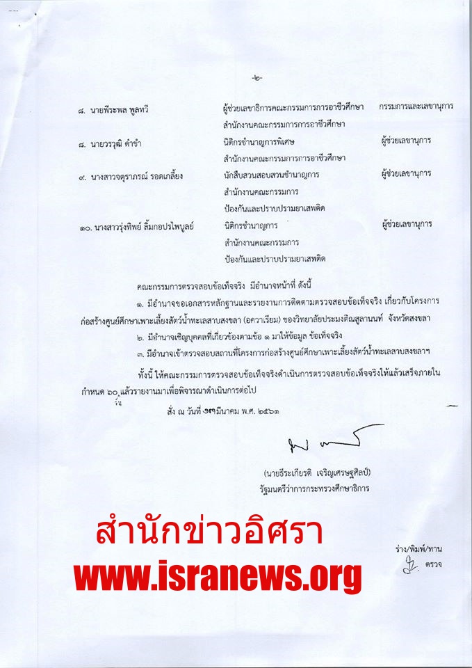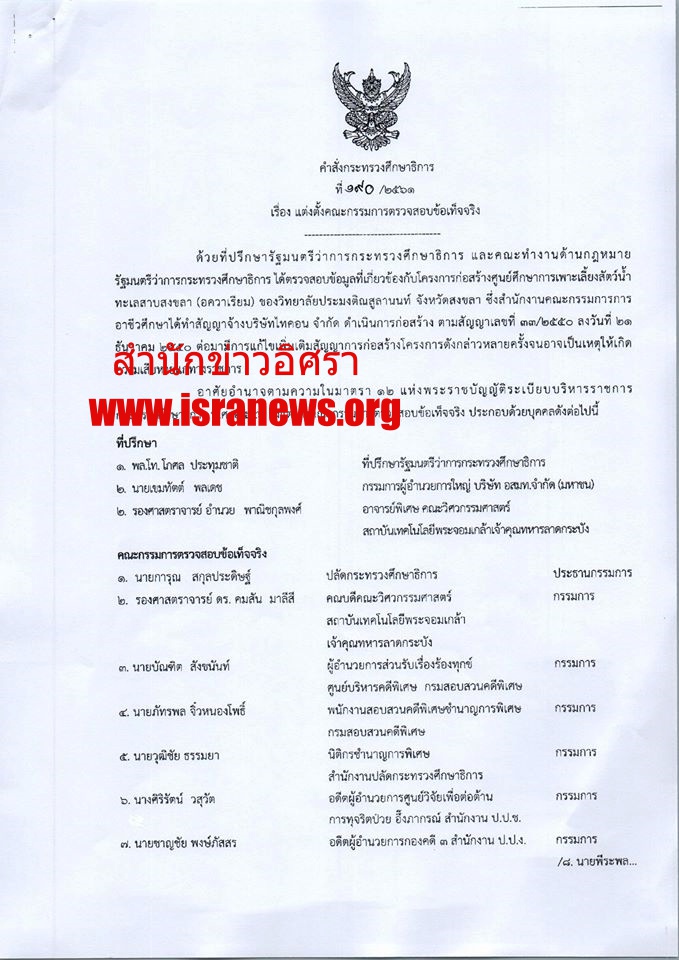 • เผยโฉมคำสั่งรมว.ศธ.ตั้งคกก.สอบอควาเรียมสงขลา1.4 พันล.ขีดเส้น60วันต้องเสร็จ