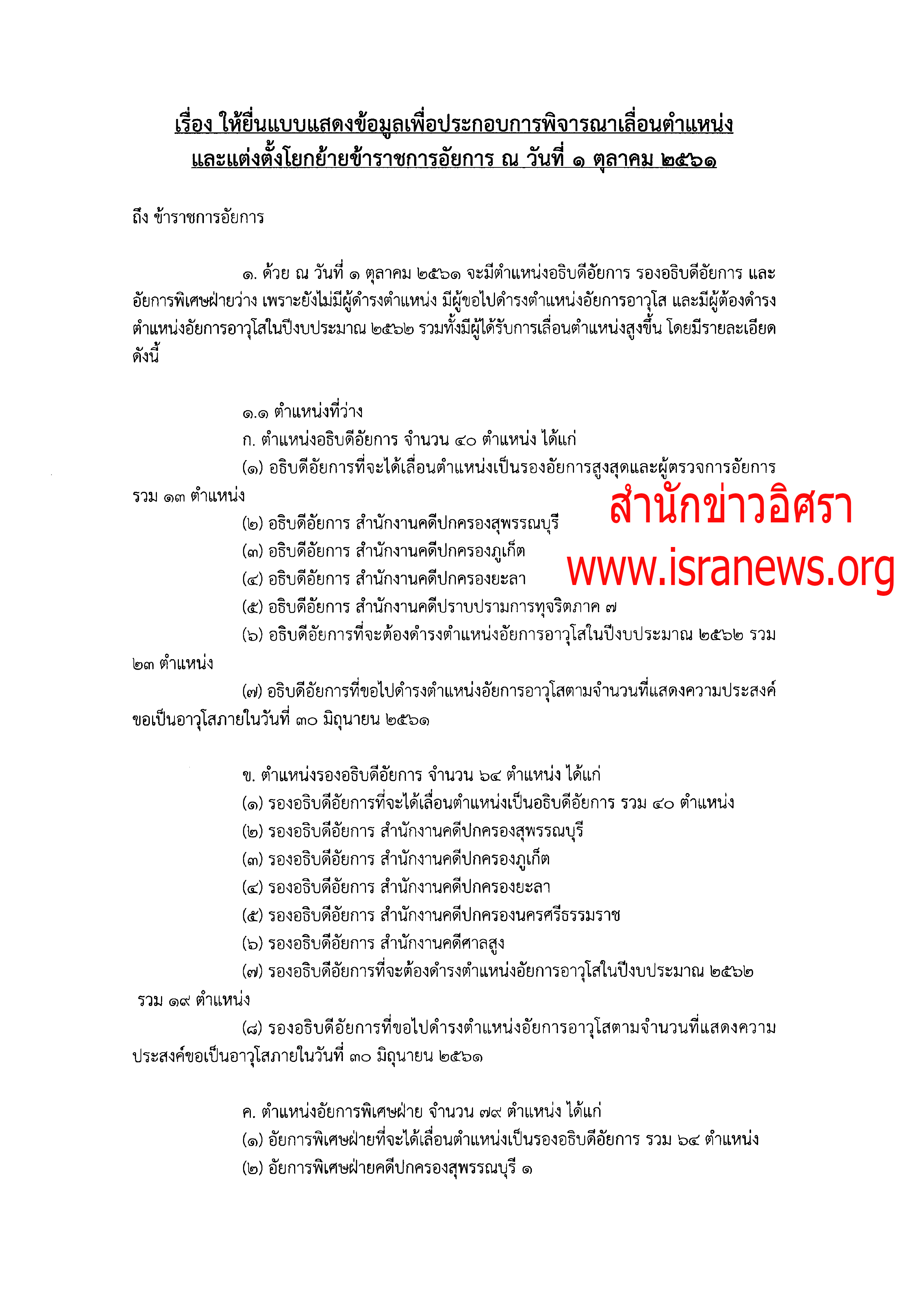 สำนักข่าวอิศรา รายงานว่า สำนักงานคณะกรรมการข้าราชการอัยการ(ก.อ.)ได้ออกประกาศแจ้งเวียนถึงข้าราชการอัยการ เรื่อง การให้ยื่นแบบแสดงข้อมูลเพื่อประกอบการพิจารณาเลื่อนตำแหน่งและแต่งตั้งโยกย้ายข้าราชการอัยการ ระบุเนื้อหา ว่า ณ วันที่ 1 ตุลาคม 2561 จะมีตำแหน่งอธิบดีอัยการ รองอธิบดีอัยการ และอัยการพิเศษฝ่ายว่าง เพราะยังไม่มีผู้ดำรงตำแหน่ง มีผู้ขอไปดำรงตำแหน่งอัยการอาวุโส และมีผู้ต้องดำรงตำแหน่งอัยการอาวุโสในปีงบประมาณ 2562 รวมทั้งมีผู้ได้รับการเลื่อนตำแหน่งสูงขึ้น รวมจำนวน 183 ตำแหน่ง ได้แก่ อธิบดีอัยการ 40 ตำแหน่ง รองอธิบดีอัยการ 64 ตำแหน่ง อัยการพิเศษฝ่าย 79 ตำแหน่ง จึงกำหนดให้ข้าราชการที่อยู่ในลำดับอาวุโสที่อาจจะได้รับการเลื่อนตำแหน่งสูงขึ้นในแต่ละระดับ หรือข้าราชการอัยการที่มีความประสงค์จะเปลี่ยนสำนักงานที่ปฏิบัติหน้าที่ ยื่นแบบแสดงข้อมูลเพื่อประกอบการพิจารณาโยกย้ายต่อสำนักงาน ก.อ. ภายในวันที่ 30 มิ.ย.2561 เพื่อสำนักงานอัยการสูงสุดจะได้นำข้อมูลไปประกอบการพิจารณาจัดทำบัญชีแต่งตั้งโยกย้ายข้าราชการอัยการเสนอ ก.อ. พิจารณาต่อไป