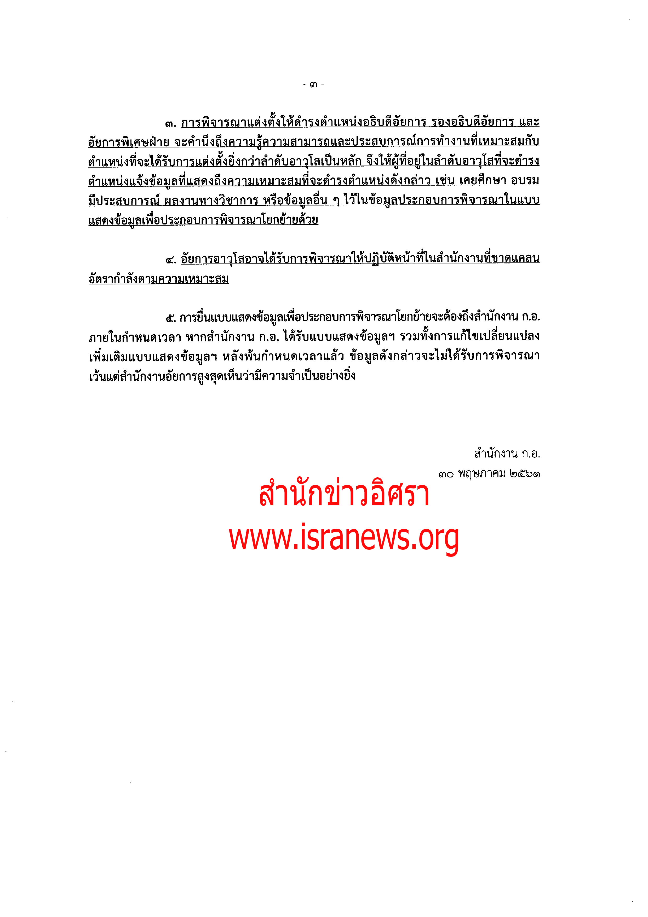 นอกจากนี้ เนื่องจากในปีงบประมาณ 2561 จะมีอัยการผู้เชี่ยวชาญพิเศษได้รับการเลื่อนตำแหน่งสูงขึ้นจำนวน 79 ตำแหน่ง จึงให้อัยการผู้เชี่ยวชาญพิเศษที่มีความประสงค์จะเปลี่ยนสำนักงานที่ปฏิบัติหน้าที่ สามารถยื่นแบบแสดงข้อมูลเพื่อประกอบการพิจารณาโยกย้ายต่อสำนักงาน ก.อ. ได้ภายในวันที่ 30 มิ.ย.2561 เพื่อสำนักงานอัยการสูงสุดจะได้นำข้อมูลดังกล่าวประกอบการพิจารณาจัดทำบัญชีแต่งตั้งโยกย้ายข้าราชการอัยการเสนอ ก.อ.เพื่อพิจารณาต่อไป เช่นกัน
