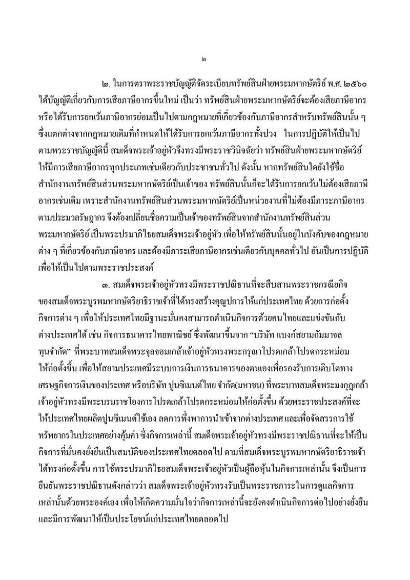 2.ในการตราพระราชบัญญัติจัดระเบียบทรัพย์สินฝ่ายพระมหากษัตริย์ พ.ศ.2560 ได้บัญญัติเกี่ยวกับการเสียภาษีอากรขึ้นมาใหม่ เป็นว่า ทรัพย์สินฝ่ายพระมหากษัตริย์จะต้องเสียภาษีอากรหรือได้รับการยกเว้นภาษีอากรย่อมเป็นไปตามกฎหมายที่เกี่ยวข้องกับภาษีอากรสำหรับทรัพย์สินนั้นๆ ซึ่งแตกต่างจากกฎหมายเดิมที่กำหนดให้ได้รับการยกเว้นภาษีอากรทั้งปวง ในการปฏิบัติให้เป็นไปตามพระราชบัญญัตินี้ สมเด็จพระเจ้าอยู่หัวจึงทรงมีพระราชวินิจฉัยว่า ทรัพย์สินฝ่ายพระมหากษัตริย์ให้มีการเสียภาษีอากรทุกประเภทเช่นเดียวกับประชาชนทั่วไป