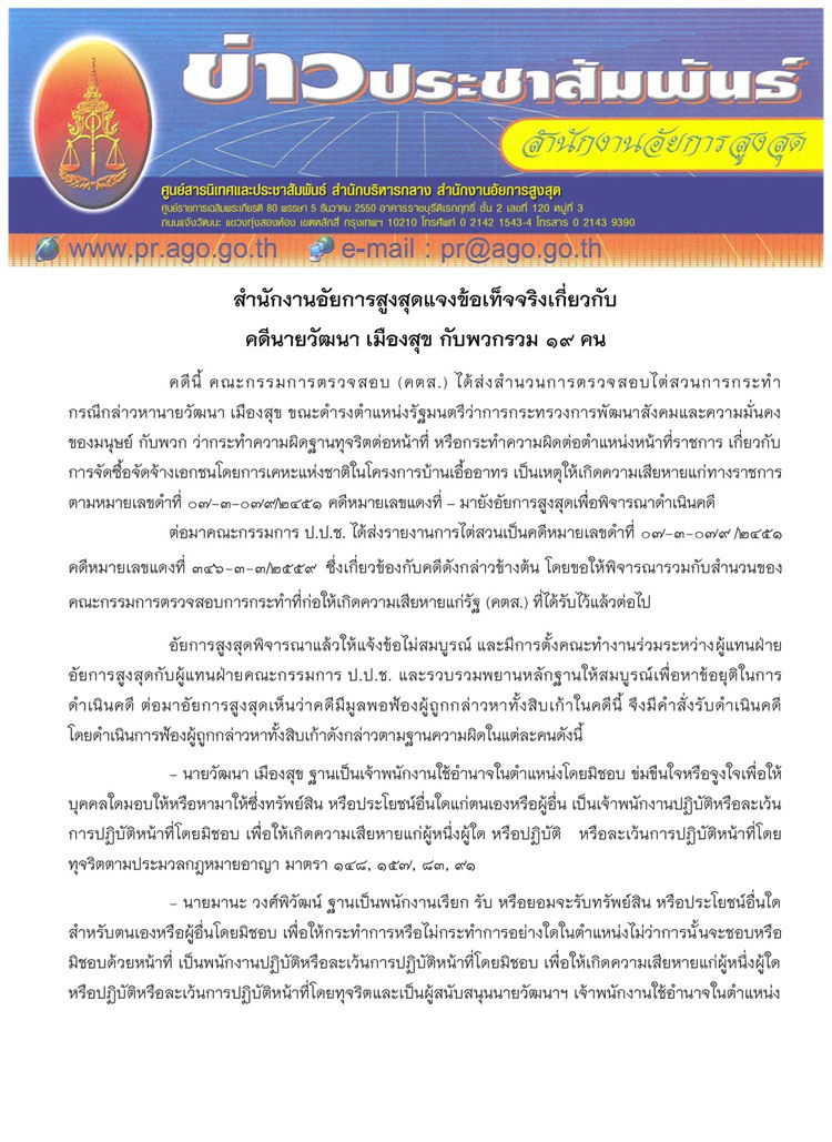 ผู้สื่อข่าวสำนักข่าวอิศรา www.isranews.org รายงานว่า เมื่อวันที่ 26 มิ.ย. 2561 สำนักงานอัยการสูงสุด (อสส.) เผยแพร่หนังสือชี้แจงสื่อมวลชน จากกรณีที่เมื่อวันที่ 9 พ.ค.2 561 อสส. เป็นโจทก์ยื่นฟ้อง นายวัฒนา เมืองสุข อดีต รมว.การพัฒนาสังคมและความมั่นคงของมนุษย์ จำเลยที่ 1 กับพวกรวม 9 ราย คดีโครงการก่อสร้างบ้านเอื้ออาทร ต่อศาลฎีกาแผนกคดีอาญาของผู้ดำรงตำแหน่งทางการเมือง ไปแล้วนั้น
