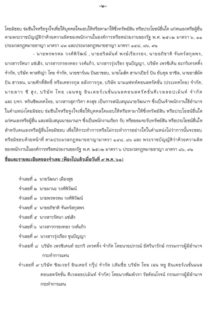 1.นายวัฒนา เมืองสุข ฐานเป็นเจ้าพนักงานใช้อำนาจในตำแหน่งโดยมิชอบ ข่มขืนหรือจูงใจเพื่อให้บุคคลใดมอบให้หรือหามาให้ซึ่งทรัพย์สิน หรือประโยชน์อื่นใด แก่ตนเองหรือผู้อื่น เป็นเจ้าพนักงานปฏิบัติหรือละเว้นการปฏิบัติหน้าที่โดยทุจริต ตามประมวลกฎหมายอาญา มาตรา 148, 157, 83 และ 91