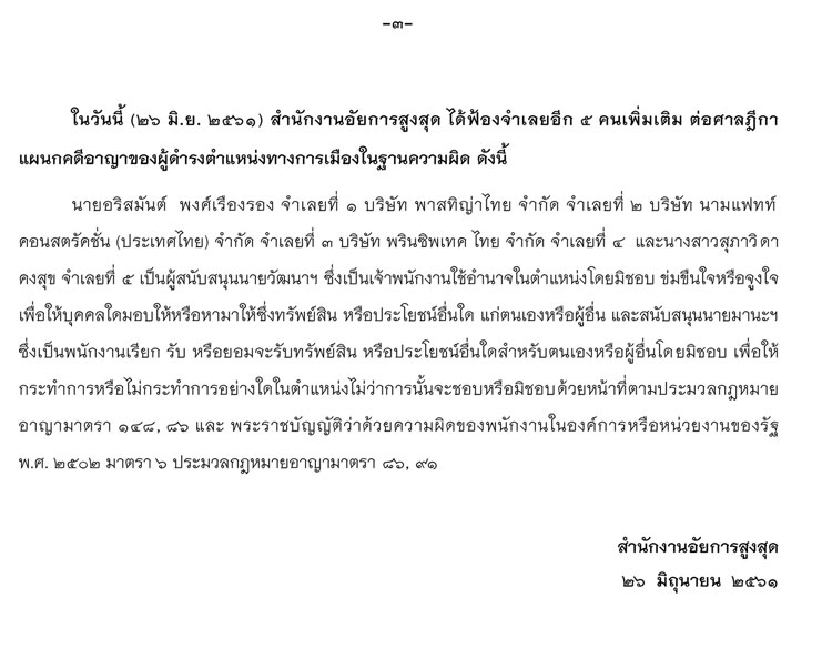 อสส. ฟ้องเพิ่มอีก 5 ราย พันคดีบ้านเอื้ออาทร ‘กี้ร์-อริสมันต์’ โดนอีกคดี ฐานสนับสนุน ‘วัฒนา เมืองสุข-มานะ วงศ์พิวัฒน์’ เป็นเจ้าพนักงานใช้อำนาจหน้าที่โดยมิชอบ ข่มขืนใจให้บุคคลมอบให้ซึ่งทรัพย์สิน บ.พาสทิญ่าไทย-บ.นาแฟทท์ฯ-บ.พรินซิพแทคฯ ติดโผด้วย