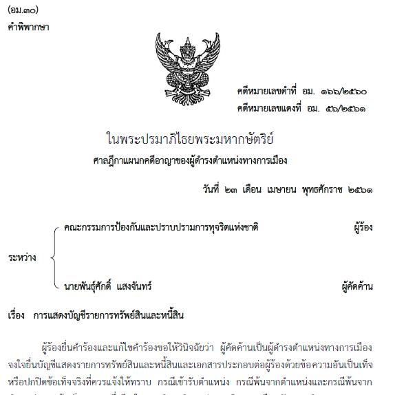 นายพันธุ์ศักดิ์ แสงจันทร์ สมาชิกสภาเมืองพัทยา อ.บางละมุง จ.ชลบุรี จงใจยื่นบัญชีแสดงรายการทรัพย์สิน และหนี้สินและเอกสารประกอบต่อคณะกรรมการ ป.ป.ช. ด้วยข้อความอันเป็นเท็จหรือปกปิดข้อเท็จจริงที่ควรแจ้งให้ทราบ กรณีเข้ารับตำแหน่ง กรณีพ้นจากตำแหน่ง และกรณีพ้นจากตำแหน่งมาแล้วเป็นเวลาหนึ่งปี ในการดำรงตำแหน่งสมาชิกสภาเมืองพัทยา ตามพระราชบัญญัติประกอบรัฐธรรมนูญว่าด้วยการป้องกันและปราบปรามการทุจริต พ.ศ. 2542 มาตรา 32 และมาตรา 33 ห้ามมิให้ผู้คัดค้านดำรงตำแหน่งทางการเมืองหรือดำรงตำแหน่งใดในพรรคการเมืองเป็นเวลาห้าปี นับแต่วันที่ 1 เม.ย.2558 ซึ่งเป็นวันที่ผู้คัดค้านพ้นจากตำแหน่งตามพระราชบัญญัติประกอบรัฐธรรมนูญว่าด้วยการป้องกันและปราบปรามการทุจริต พ.ศ. 2542 มาตรา 34 วรรคสอง กับมีความผิดตามพระราชบัญญัติประกอบรัฐธรรมนูญว่าด้วยการป้องกันและปราบปรามการทุจริต พ.ศ. 2542 มาตรา 119 ฐานเป็นเจ้าหน้าที่ของรัฐจงใจยื่นบัญชีแสดงรายการทรัพย์สินและหนี้สินและเอกสารประกอบต่อคณะกรรมการ ป.ป.ช. ด้วยข้อความอันเป็นเท็จหรือปกปิดข้อเท็จจริงที่ควรแจ้งให้ทราบ กรณีพ้นจากตำแหน่งและกรณีพ้นจากตำแหน่งมาแล้วเป็นเวลาหนึ่งปี ในการดำรงตำแหน่งสมาชิกสภาเมืองพัทยา การกระทำของผู้คัดค้านเป็นความผิดหลายกรรมต่างกัน ให้ลงโทษทุกกรรม เป็นกระทงความผิดไปตามประมวลกฎหมายอาญา มาตรา 91 จำคุกกระทงละ 2 เดือน และปรับกระทงละ 8,000 บาท รวม 2 กระทง เป็นจำคุก 4 เดือน และปรับ 16,000 บาท ผู้คัดค้านให้การรับสารภาพ เป็นประโยชน์แก่การพิจารณา มีเหตุบรรเทาโทษ ลดโทษให้กึ่งหนึ่ง คงจำคุก 2 เดือน และปรับ 8,000 บาท ไม่ปรากฏว่า ผู้คัดค้านเคยได้รับโทษจำคุกมาก่อน โทษจำคุกจึงให้รอการลงโทษไว้มีกำหนด 1 ปี (คดีหมายเลขแดงที่ อม.56/2561/23 เม.ย.2561)