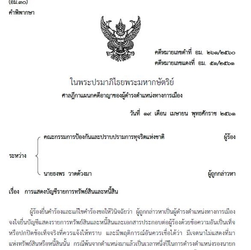 1.นายธงพร วาดด้วงมา รองนายกองค์การบริหารส่วนตำบล (อบต.) พระประโทน อ.เมืองนครปฐม จ.นครปฐม จงใจยื่นบัญชีแสดงรายการทรัพย์สิน และหนี้สินและเอกสารประกอบต่อคณะกรรมการ ป.ป.ช. ด้วยข้อความอันเป็นเท็จ หรือปกปิดข้อเท็จจริงที่ควรแจ้งให้ทราบ กรณีพ้นจากตาแหน่งมาแล้วเป็นเวลาหนึ่งปี ในการดำรงตำแหน่ง รองนายก อบต.พระประโทน ครั้งที่ 1 และกรณีเข้ารับตำแหน่งรองนายก อบต.พระประโทน ครั้งที่ 2 ตามพระราชบัญญัติประกอบรัฐธรรมนูญว่าด้วยการป้องกันและปราบปรามการทุจริต พ.ศ. 2542 มาตรา 32 และมาตรา 33 ให้ผู้ถูกกล่าวหาพ้นจากตำแหน่งรองนายก อบต. พระประโทน ครั้งที่ 2 ที่ดำรงอยู่ในวันที่ 12 ก.พ.2561 ซึ่งเป็นวันที่ศาลฎีกาแผนกคดีอาญา ของผู้ดำรงตำแหน่งทางการเมืองมีคำสั่งให้ผู้ถูกกล่าวหาหยุดปฏิบัติหน้าที่ และห้ามมิให้ผู้ถูกกล่าวหาดำรงตำแหน่งทางการเมืองหรือดำรงตำแหน่งใดในพรรคการเมืองเป็นเวลาห้าปีนับแต่วันที่ 19 เม.ย. 2561 ซึ่งเป็นวันที่ศาลฎีกาแผนกคดีอาญาของผู้ดำรงตำแหน่งทางการเมืองวินิจฉัย ตามพระราชบัญญัติประกอบรัฐธรรมนูญว่าด้วยวิธีพิจารณาคดีอาญาของผู้ดำรงตำแหน่งทางการเมือง พ.ศ. 2560 มาตรา 17 วรรคสอง และพระราชบัญญัติประกอบรัฐธรรมนูญว่าด้วยการป้องกันและปราบปรามการทุจริต พ.ศ. 2542 มาตรา 34 วรรคหนึ่ง กับมีความผิดตามพระราชบัญญัติประกอบรัฐธรรมนูญว่าด้วย การป้องกันและปราบปรามการทุจริต พ.ศ. 2542 มาตรา 119 การกระทำของผู้ถูกกล่าวหา เป็นความผิดหลายกรรมต่างกัน ให้ลงโทษทุกกรรมเป็นกระทงความผิดไปตามประมวลกฎหมายอาญา มาตรา 91 จาคุกกระทงละ 2 เดือน และปรับกระทงละ 8,000 บาท รวม 2 กระทง เป็นจำคุก 4 เดือน และปรับ 16,000 บาท ผู้ถูกกล่าวหาให้การรับสารภาพ เป็นประโยชน์แก่การพิจารณา มีเหตุบรรเทาโทษ ลดโทษให้กึ่งหนึ่งตามประมวลกฎหมายอาญา มาตรา 78 คงจำคุก 2 เดือน และปรับ 8,000 บาท ไม่ปรากฏว่าผู้ถูกกล่าวหาเคยได้รับโทษจำคุกมาก่อน โทษจำคุกจึงให้รอ การลงโทษไว้มีกาหนด 1 ปี