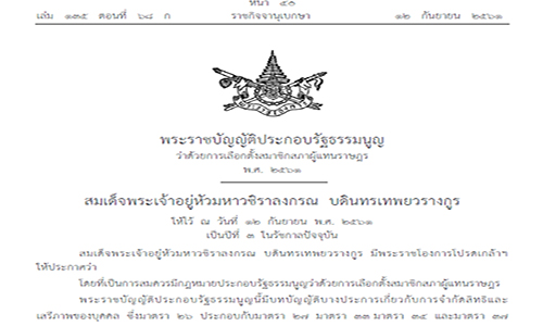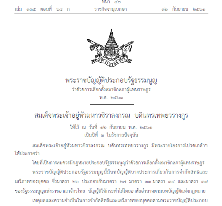 สำนักข่าวอิศรา www.isranews.org รายงานว่า วันที่ 12 ก.ย.2561 ราชกิจจานุเบกษา เผยแพร่ พระราชบัญญัติประกอบรัฐธรรมนูญ 2 ฉบับคือ