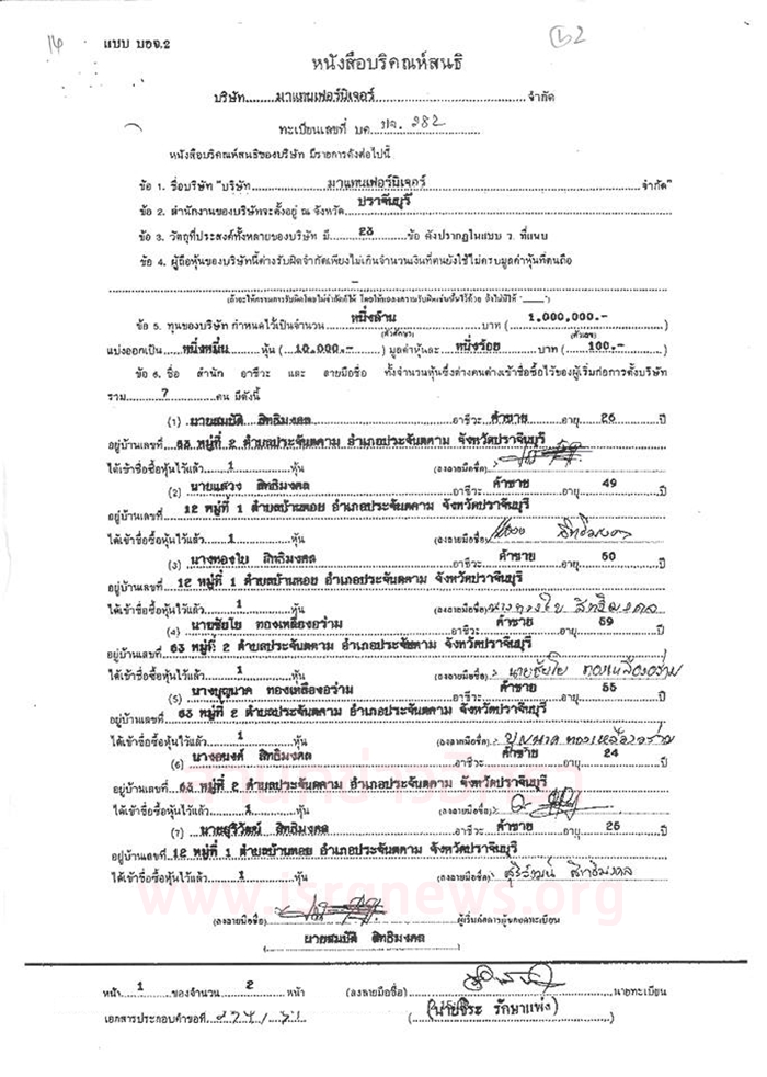 ล่าสุด สำนักข่าวอิศรา ได้ติดต่อไปยัง นายสมบัติ สิทธิมงคล (ปัจจุบันเป็นสมาชิกองค์การบริหารส่วนจังหวัดปราจีนบุรี) ที่ปรากฎชื่อเป็นกรรมการผู้ริเริ่มจดทะเบียนและถือหุ้นใหญ่คนแรก (2537-24ต.ค.2556) ก่อนที่จะมีการแจ้งเปลี่ยนตัวกรรมการและผู้ถือหุ้นใหญ่เป็นนายวราพงษ์ ขาวพราย และเป็นนายไพบูลย์ ศรีทอง ในเวลาต่อมา เพื่อขอให้ชี้แจงข้อเท็จจริงเรื่องนี้