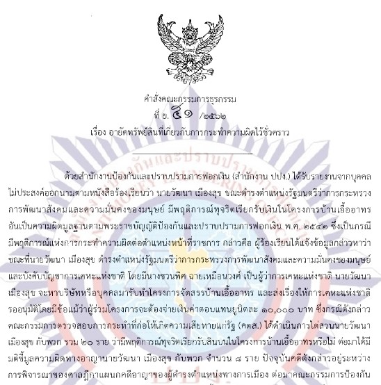 เปิดคำสั่ง ปปง.อายัดทรัพย์คดีสินบนบ้านเอื้ออาทร ‘วัฒนา เมืองสุข’ ที่ดิน 13 แปลง 51.5 ล้าน ในชื่อ ‘สุดา คุณจักร’ ตัวละครคดีขายข้าวจีทูจี เสี่ยเปี๋ยง หลักถูกร้องเรียกหัวคิว หลังละ 10,000 บาท