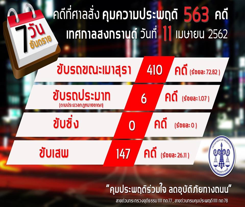 ขณะที่นายประสาร มหาลี้ตระกูล อธิบดีกรมคุมประพฤติ เผยสถิติที่ศาลสั่งคุมความประพฤติวันแรกที่มีการควบคุมเข้มงวด วันที่ 11 เมษายน ในช่วงเทศกาลสงกรานต์ ประจำปี 2562 มีคดีเข้าสู่กระบวนการคุมประพฤติทั่วประเทศ 563 คดี