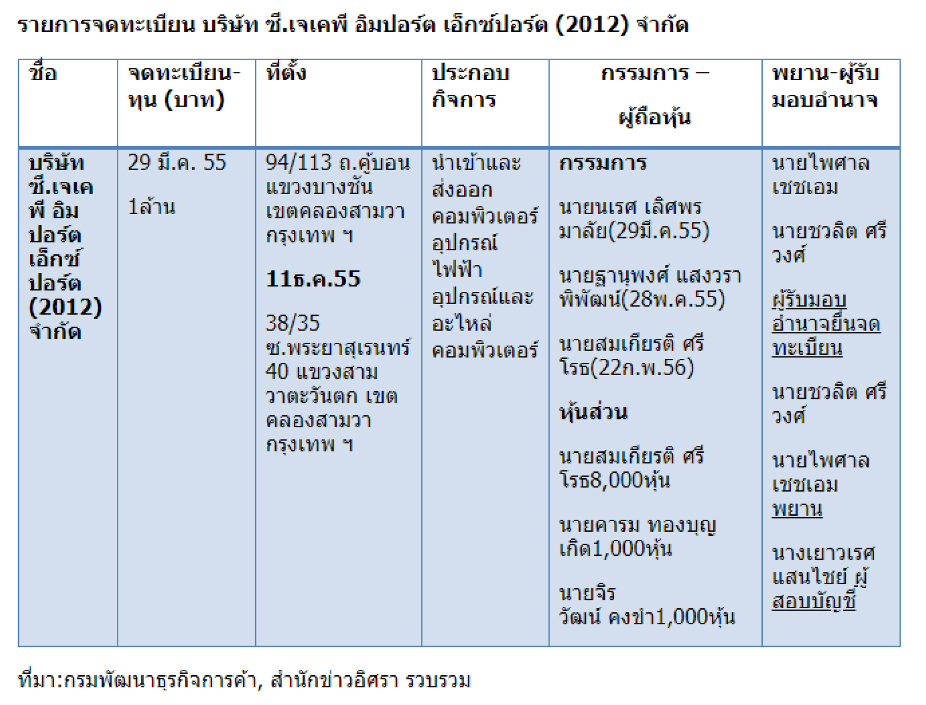 สำนักข่าวอิศรารายงานว่า บริษัท ซี. เจเคพี อิมปอร์ต เอ็กซ์ปอร์ต (2012) จำกัด จดทะเบียน 29 มี.ค. 55 [วันเดียวกับ บจ.เจเคพี อิมพอร์ต เอ็กซ์ปอร์ต (2012) และ บจ.เจเคพีเอ็กซ์ซิม (ไทยแลนด์)] ทุน 1 ล้านบาท ประกอบกิจการค้า นำเข้าและส่งออก อุปกรณ์ไฟฟ้า คอมพิวเตอร์ เน็ทเวิร์ค อุปกรณ์ต่อพ่วง รวมทั้งอุปกรณ์ ที่ตั้งเลขที่ 94/113 ถ.คู้บอน แขวงบางชัน เขตคลองสามวา กรุงเทพ ฯ มีผู้ถือหุ้น 3 คน 1.นายนเรศ เลิศพรมาลัย อายุ 20 ปี อยู่บ้านเลขที่ 3 ซ.ประชาอุทิศ 75 แขวงทุ่งครุ เขตทุ่งครุ กรุงเทพ ฯ จำนวน 8,000 หุ้น 2.น.ส.บุญเลิศ มีจำรัส อายุ 44 ปี อยู่บ้านเลขที่ 3/67 หมู่ที่ 4 ต.อ้อมน้อย อ.กระทุ่มแบน จ.สมุทรสาคร จำนวน 1,000 หุ้น และ 3.นายคารม ทองบุญเลิศ อายุ 47 ปี อยู่บ้านเลขที่ 49 ซ.เพชรเกษม 110 แยก 4-3-1 แขวงหนองค้างพลู เขตหนองแขม กรุงเทพ ฯ จำนวน 1,000 หุ้น รวมทั้งสิ้น 10,000 หุ้น มูลค่าหุ้นละ 100 บาท ต่อมา 28 พ.ค. 55 จดทะเบียน นายฐาณุพงศ์ แสงวราพิพัฒน์ เข้าเป็นกรรมการ 11 ธ.ค. 55 จดทะเบียนแก้ไขสำนักงาน เป็นเลขที่ 38/35 ซ.พระยาสุเรนทร์ 40 แขวงสามวาตะวันตก เขตคลองสามวา กรุงเทพ ฯ กระทั่ง 22 ก.พ. 56 นายสมเกียรติ ศรีโรธ เข้าเป็นกรรมการ แทน นายฐานุพงศ์ แสงวราพิพัฒน์ ออก ไม่ปรากฏงบการเงินต่อกรมพัฒนาธุรกิจการค้า