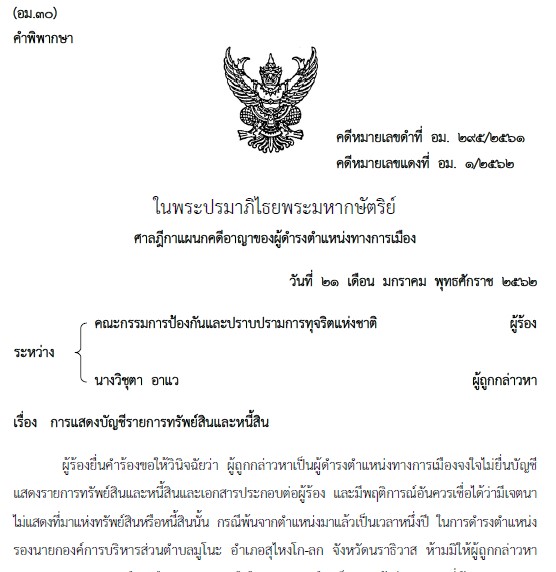 คดีนี้ ผู้ร้องมีมติเมื่อวันที่ 28 มิถุนายน 2561 ก่อนวันที่ 22 กรกฎาคม 2561 ที่พระราชบัญญัติประกอบรัฐธรรมนูญว่าด้วยการป้องกันและปราบปรามการทุจริต พ.ศ. 2561 ใช้บังคับ และผู้ร้องยื่นคำร้องต่อศาลในวันที่ 25 ตุลาคม 2561อันเป็นเวลาภายหลังที่พระราชบัญญัติประกอบรัฐธรรมนูญว่าด้วยการป้องกันและปราบปรามการทุจริตพ.ศ. 2561 ใช้บังคับแล้ว กรณีจึงไม่ต้องด้วยบทเฉพาะกาล มาตรา 192 วรรคท้าย ที่บัญญัติว่า “เพื่อประโยชน์ในการพิจารณาและพิพากษาของศาล สำหรับคดีที่ยื่นฟ้องหรือยื่นคำร้องต่อศาลไว้แล้วก่อนวันที่พระราชบัญญัติประกอบรัฐธรรมนูญนี้ใช้บังคับ ให้ถือว่าพระราชบัญญัติประกอบรัฐธรรมนูญว่าด้วยการป้องกันและปราบปรามการทุจริต พ.ศ. 2542 และที่แก้ไขเพิ่มเติม ยังมีผลใช้บังคับอยู่จนกว่าคดีจะถึงที่สุด” ด้วย
