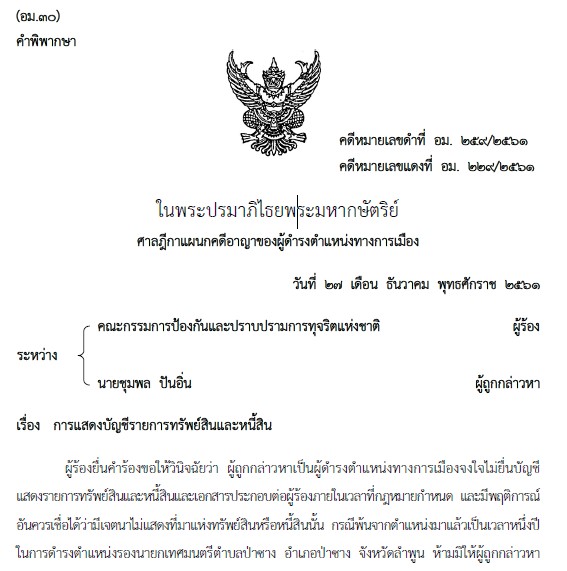 คดีแรก นายชุมพล ปันอิ่น ถูกกล่าวหาเป็นผู้ดำรงตำแหน่งทางการเมืองจงใจไม่ยื่นบัญชีแสดงรายการทรัพย์สินและหนี้สินและเอกสารประกอบต่อผู้ร้องภายในเวลาที่กฎหมายกำหนด และมีพฤติการณ์ อันควรเชื่อได้ว่ามีเจตนาไม่แสดงที่มาแห่งทรัพย์สินหรือหนี้สินนั้น กรณีพ้นจากตำแหน่งมาแล้วเป็นเวลาหนึ่งปี ในการดำรงตำแหน่งรองนายกเทศมนตรีต.ป่าซาง อ.ป่าซาง จ.ลำพูน