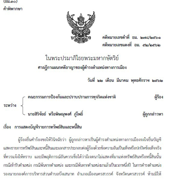 สำนักข่าวอิศรา www.isranews.org รายงานว่า วันที่ 22 มี.ค. 2562 ศาลฎีกาแผนกคดีอาญาของผู้ดำรงตำแหน่งทางการเมืองมีคำพิพากษา นายสิริชัยย์ หรือ พิษณุพงศ์ ภู่โพธิ์ รองนายกองค์การบริหารส่วนตำบล (อบต.) บึงเสนาท อ.เมืองนครสวรรค์ จ.นครสวรรค์ จงใจยื่นบัญชีแสดงรายการทรัพย์สินและหนี้สินและเอกสารประกอบต่อผู้ร้องด้วยข้อความอันเป็นเท็จหรือปกปิดข้อเท็จจริงที่ควรแจ้ง ให้ทราบต่อคณะกรรมการป้องกันและปราบปรามการทุจริตแห่งชาติ (คณะกรรมการ ป.ป.ช.) โดย ไม่แสดงรายการเงินฝากธนาคารออมสิน เลขที่บัญชี 020014141475 ซึ่งมีเงินเคลื่อนไหวในบัญชีอยู่ตลอด ยอดเงินคงเหลือ ณ วันที่มีหน้าที่ ยื่นบัญชีกรณีเข้ารับตำแหน่ง กรณีพ้นจากตำแหน่ง และกรณีพ้นจากตำแหน่งมาแล้วเป็นเวลาหนึ่งปี 393.27 บาท จำนวน 100.24 บาท และจำนวน 62.54 บาท ตามลำดับ