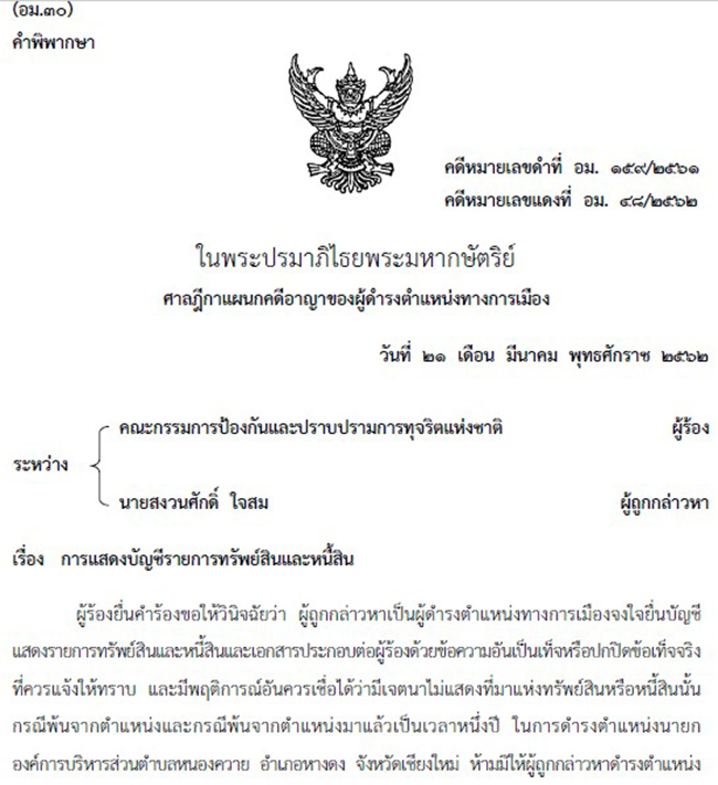 พิพากษาว่า นายสงวนศักดิ์ ใจสม ผู้ถูกกล่าวหาจงใจยื่นบัญชีแสดงรายการทรัพย์สินและหนี้สิน และเอกสารประกอบต่อผู้ร้องด้วยข้อความอันเป็นเท็จหรือปกปิดข้อเท็จจริงที่ควรแจ้งให้ทราบ กรณีพ้นจากตำแหน่งในการดำรงตำแหน่งนายก อบต.หนองควาย อ.หางดง จ.เชียงใหม่ ตามพระราชบัญญัติประกอบรัฐธรรมนูญว่าด้วยการป้องกันและปราบปรามการทุจริต พ.ศ. 2542 ห้ามมิให้ผู้ถูกกล่าวหาดำรงตำแหน่งทางการเมืองหรือดำรงตำแหน่งใด ในพรรคการเมืองเป็นเวลาห้าปีนับแต่วันที่ 6 ก.ย.2556 ซึ่งเป็นวันที่ผู้ถูกกล่าวหาพ้นจากตำแหน่ง นายก อบต.หนองควาย กับมีความผิดตามพระราชบัญญัติ ประกอบรัฐธรรมนูญว่าด้วยการป้องกันและปราบปรามการทุจริต พ.ศ.2542 มาตรา 119 จำคุก 2 เดือน และปรับ 8,000 บาท ผู้ถูกกล่าวหาให้การรับสารภาพ เป็นประโยชน์แก่การพิจารณา มีเหตุบรรเทาโทษ ลดโทษให้กึ่งหนึ่ง คงจำคุก 1 เดือน และปรับ 4,000 บาท ไม่ปรากฏว่าผู้ถูกกล่าวหาเคยได้รับโทษจำคุกมาก่อน โทษจำคุกจึงให้รอการลงโทษไว้มีกำหนด 1 ปี (คดีหมายเลขแดงที่ อม. 48/2562 วันที่ 21 มี.ค.2562 )