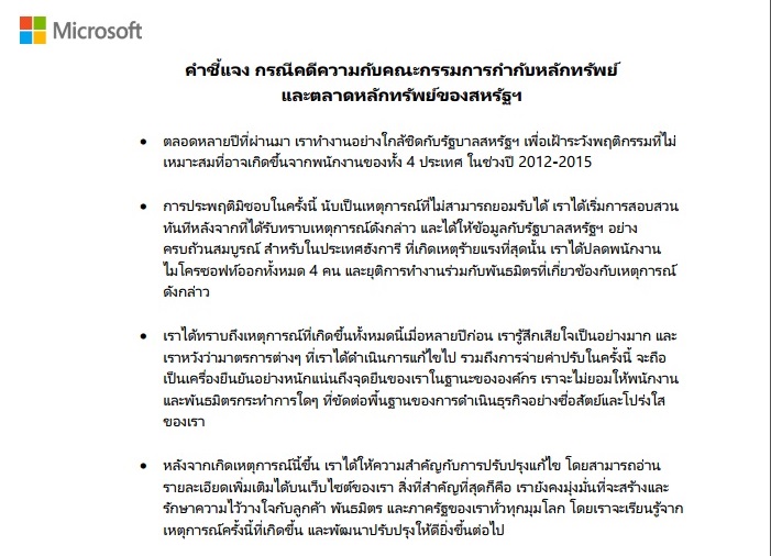 เสียใจ-ยอมจ่ายค่าปรับ! เปิดคำแถลงไมโครซอฟท์ คดีสินบนข้ามชาติ 4 ปท.