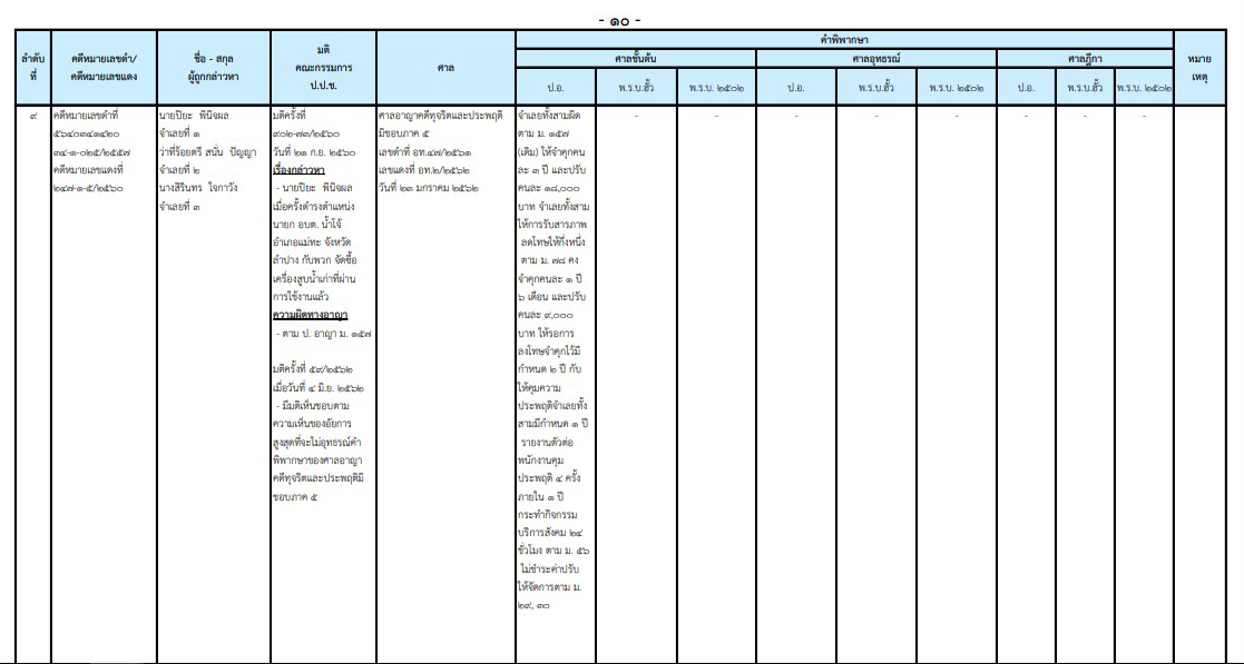ป.ป.ช. แพร่ผลคดีชี้มูลความผิด 'ปิยะ พินิจผล' อดีตนายกอบต.น้ำโจ้ ลำปาง- พวก 2 ราย จัดซื้อเครื่องสูบน้ำเก่าที่ผ่านการใช้งานแล้ว ล่าสุด ศาลอาญาคดีทุจริตประพฤติมิชอบภาค 5 พิพากษาจำคุก 3 ปี ปรับคนละ 1.8 หมื่น รับสารภาพลดโทษให้กึ่งหนึ่ง เหลือคนละ 1 ปี 6 เดือน ปรับ 9 พัน แต่รอการลงโทษจำคุก2 ปี พร้อมคุมความประพฤติ 1 ปี ทำกิจกรรมบริการสังคม 24 ชม.