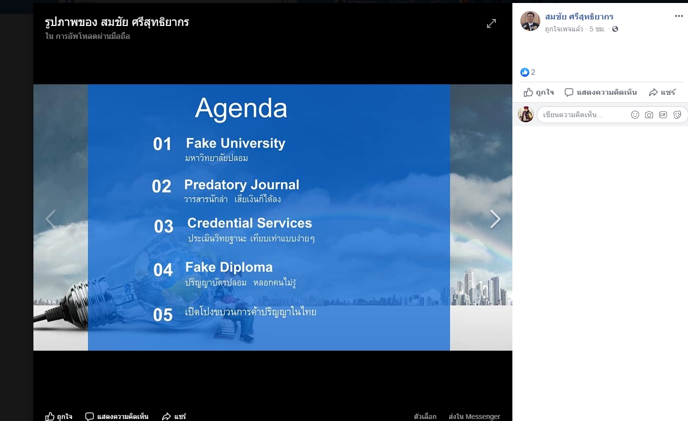 ทั้งนี้ ในช่วงเช่าวันที่ 30 ก.ย.2562 ที่ผ่านมา นายสมชัย ได้โพสต์เฟซบุ๊กส่วนตัว ระบุรายละเอียดข้อมูลขบวนการค้าปริญญาปลอมและการได้มาซึ่งปริญญาที่ไม่มีมาตรฐาน ที่จะนำไปชี้แจงต่อ คณะกรรมาธิการป้องกันและปราบปรามการทุจริตและประพฤติมิชอบ สภาผู้แทนราษฎร ว่า มีจำนวน 5 ประเด็น ได้แก่ 1. กรณีการใช้มหาวิทยาลัยปลอม 2.วารสารนักล่า เสียเงินก็ได้ลง 3.ประเมินวิทยฐานะ เทียบเท่าแบบง่ายๆ 4.ปริญญาบัตรปลอม หลอกคนไม่รู้ และ 5.เปิดโปงขบวนการค้าปริญญาในประเทศไทย