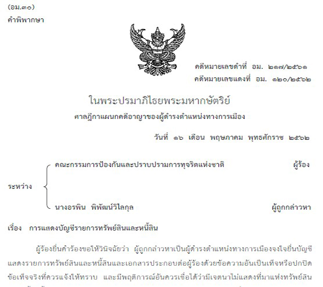 พิพากษาว่า นางอรพิน พิพัฒน์วิไลกุล ผู้ถูกกล่าวหาจงใจยื่นบัญชีแสดงรายการทรัพย์สิน และหนี้สินและเอกสารประกอบต่อผู้ร้องด้วยข้อความอันเป็นเท็จหรือปกปิดข้อเท็จจริงที่ควรแจ้งให้ทราบ กรณีพ้นจากตำ แหน่งที่ปรึกษาประธานรัฐสภา ตามพระราชบัญญัติประกอบรัฐธรรมนูญ ว่าด้วยการป้องกันและปราบปรามการทุจริต พ.ศ. 2542 มาตรา 32 และมาตรา 33 ห้ามมิให้ผู้ถูกกล่าวหาดำรงตำแหน่งทางการเมืองหรือดำรงตำ แหน่งใดในพรรคการเมืองเป็นเวลาห้าปีนับแต่วันที่ 2 สิงหาคม 2556 ซึ่งเป็นวันที่ผู้ถูกกล่าวหาพ้นจากตำแหน่ง ตามพระราชบัญญัติประกอบรัฐธรรมนูญว่าด้วยการป้องกันและปราบปรามการทุจริต พ.ศ. 2542 มาตรา 34 วรรคสอง ข้อหาและคำขออื่นนอกจากนี้ให้ยก. (คดีหมายเลขแดงที่ อม.120/2562 วันที่ 16 พ.ค.2562)
