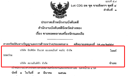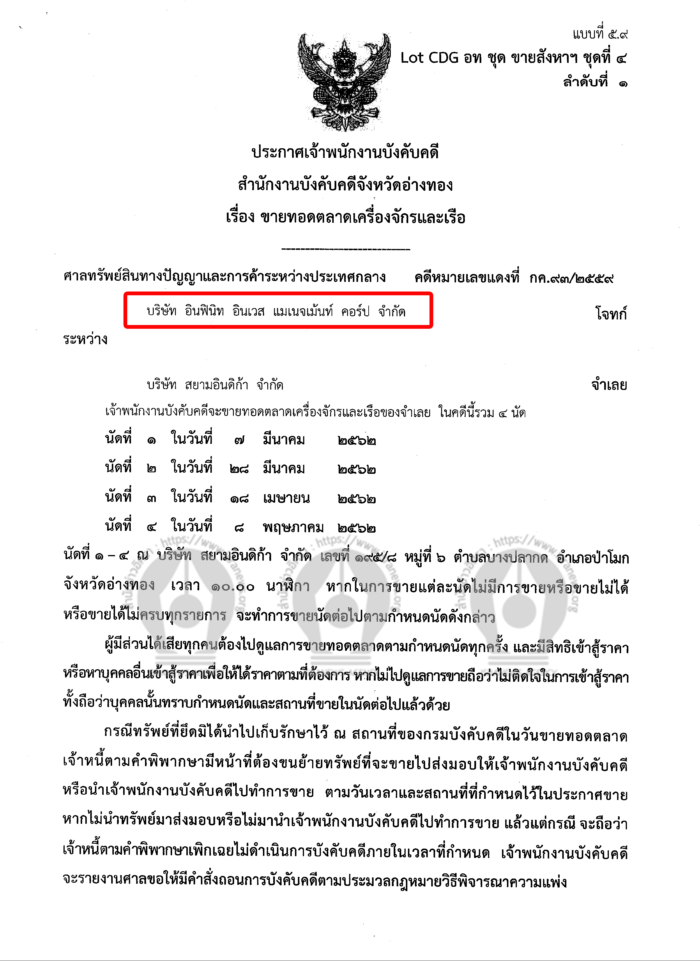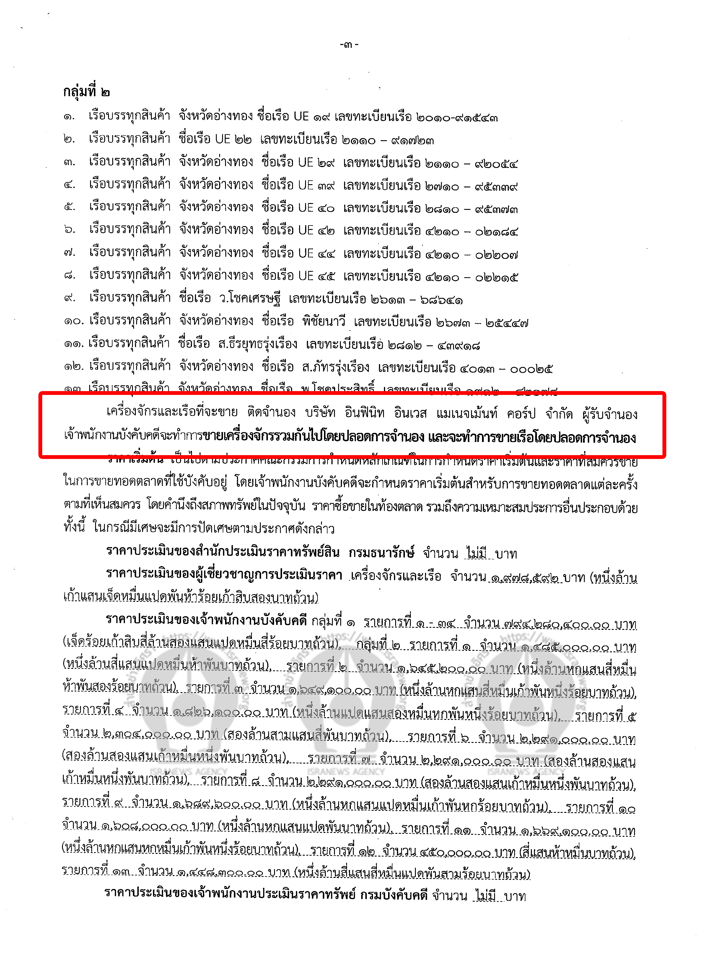 พร้อมระบุข้อมูลว่า เครื่องจักรและเรือ จำนวน 51 รายการดังกล่าวที่จะขาย ติดจำนอง บริษัท อินฟินิท อินเวส แมเนจเม้นท์ จำกัด ในฐานะผู้รับจำนอง เจ้าพนักงานบังคับคดีจะทำการขายเครื่องจักรและเรือรวมกันไปโดยปลอดการจำนอง (ดูข้อมูลประกอบ)