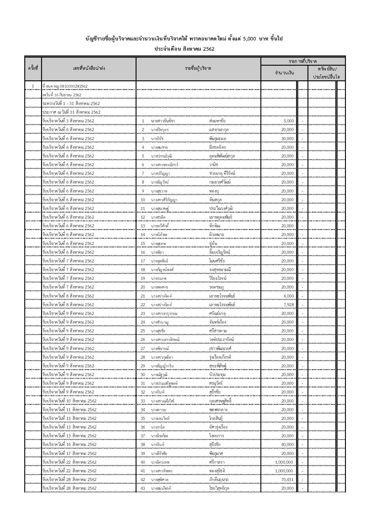 ส่วนเดือน ส.ค. 2562 มีผู้บริจาคเงินให้แก่พรรคอนาคตใหม่รวม 55 รายการ วงเงิน 5,791,647 บาท โดยรายชื่อผู้บริจาคที่น่าสนใจ ได้แก่ บริษัท เทคโนโลยี อินฟราสตรัคเจอร์ จำกัด 1.8 ล้านบาท นายไตรเทพ ศรีกาลรา (ผู้บริหารธุรกิจขายอุปกรณ์เครื่องเล่นดนตรี ProPlugin) 1 ล้านบาท น.ส.ทิพพร ทองสุโชติ 1 ล้านบาท ส่วน น.ส.พรรณิการ์ วานิช ส.ส.บัญชีรายชื่อ และโฆษกพรรคอนาคตใหม่ บริจาค 2 หมื่นบาท (ก่อนหน้านี้ในปี 2561 น.ส.พรรณิการ์ บริจาค 1 ล้านบาท) ส่วนนายปิยบุตร แสงกนกกุล ส.ส.บัญชีรายชื่อ และเลขาธิการพรรคอนาคตใหม่ บริจาค 2 หมื่นบาท เป็นต้น