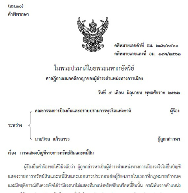 พิพากษาว่า นายวิชล แก้วถาวร ผู้ถูกกล่าวหาจงใจไม่ยื่นบัญชีแสดงรายการทรัพย์สินและหนี้สินและเอกสารประกอบต่อคณะกรรมการ ป.ป.ช. ภายในเวลาที่กฎหมายกำหนดกรณีพ้นจาก ตำแหน่งรองนายก อบต.บางพระ ตามพระราชบัญญัติประกอบรัฐธรรมนูญว่าด้วยการป้องกันและปราบปรามการทุจริต พ.ศ. 2542 มาตรา 32 และมาตรา 33 ห้ามมิให้ผู้ถูกกล่าวหาดำรงตำแหน่งทางการเมืองหรือดำรงตำแหน่งใดในพรรคการเมืองเป็นเวลาห้าปีนับแต่วันที่ 9 ก.ย.2557 ซึ่งเป็นวันที่ผู้ถูกกล่าวหาพ้นจากตำแหน่งตามพระราชบัญญัติประกอบรัฐธรรมนูญว่าด้วยการป้องกันและปราบปรามการทุจริต พ.ศ. 2542 มาตรา 34 วรรคสอง กับมีความผิดตามพระราชบัญญัติประกอบรัฐธรรมนูญว่าด้วยการป้องกันและปราบปรามการทุจริต พ.ศ. 2542 มาตรา 119 ฐานเป็นเจ้าหน้าที่ของรัฐจงใจไม่ยื่นบัญชีแสดงรายการทรัพย์สินและหนี้สินและเอกสารประกอบต่อคณะกรรมการ ป.ป.ช. ภายในเวลาที่กฎหมายกำหนดกรณีพ้นจากตำแหน่ง จำคุก 2 เดือน และปรับ 8,000 บาท ผู้ถูกกล่าวหาให้การรับสารภาพ เป็นประโยชน์แก่การพิจารณา มีเหตุบรรเทาโทษ ลดโทษให้กึ่งหนึ่งตามประมวลกฎหมายอาญา มาตรา 78 คงจำคุก 1 เดือน และปรับ 4,000 บาท ไม่ปรากฏว่าผู้ถูกกล่าวหาเคยได้รับโทษจำคุกมาก่อน โทษจำคุกจึงให้รอการลงโทษไว้มีกำหนด 1 ปี ตามประมวลกฎหมายอาญา มาตรา 56 คำขออื่น นอกจากนี้ให้ยก.(คดีหมายเลขแดงที่ อม.148/2562 วันที่ 5 มิ.ย.2562)
