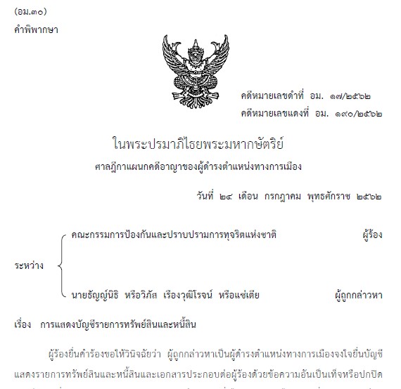 ศาลฎีกาแผนกคดีอาญาของผู้ดำรงตำแหน่งทางการเมืองมีคำสั่งให้ผู้ถูกกล่าวหาหยุดปฏิบัติหน้าที่นับแต่วันที่ 28 พ.ค.2562 ซึ่งเป็นวันที่ศาลมีคำสั่ง ให้รับคำร้องไว้พิจารณา