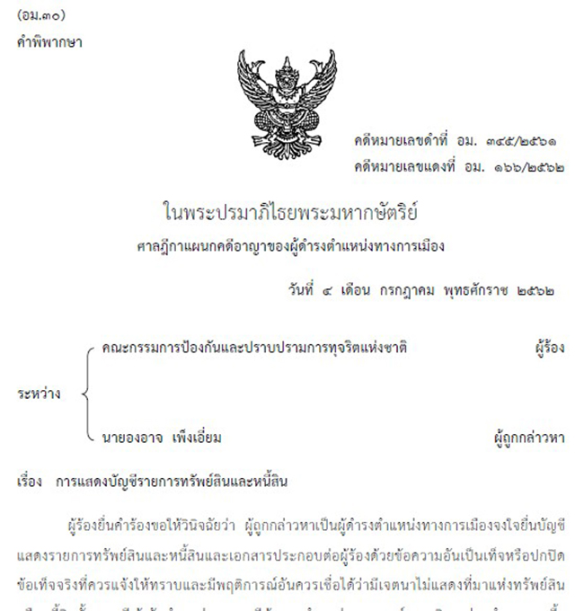 พิพากษาว่า นายองอาจ เพ็งเอี่ยม ผู้ถูกกล่าวหาจงใจยื่นบัญชีแสดงรายการทรัพย์สินและหนี้สินและเอกสารประกอบต่อผู้ร้องด้วยข้อความอันเป็นเท็จหรือปกปิดข้อเท็จจริงที่ควรแจ้งให้ทราบ กรณีเข้ารับตำแหน่งและกรณีพ้นจากตำแหน่งนายก อบต.ตาลเตี้ย ครั้งที่ 1 และกรณีเข้ารับตำแหน่งนายก อบต.ตาลเตี้ย ครั้งที่ 2ตามพระราชบัญญัติประกอบรัฐธรรมนูญว่าด้วยการป้องกันและปราบปรามการทุจริต พ.ศ. 2542 มาตรา 32 และมาตรา 33 ให้ผู้ถูกกล่าวหาพ้นจากตำแหน่งนายกองค์การบริหารส่วนตำบลตาลเตี้ย ครั้งที่ 2 ที่ดำ รงอยู่ในปัจจุบันนับแต่วันที่ 27 พ.ค.2562 ซึ่งเป็นวันที่ศาลฎีกาแผนกคดีอาญาของผู้ดำรงตำแหน่งทางการเมืองมีคำ สั่งให้ผู้ถูกกล่าวหาหยุดปฏิบัติหน้าที่ ตามพระราชบัญญัติประกอบรัฐธรรมนูญว่าด้วยการป้องกันและปราบปรามการทุจริต พ.ศ. 2542 มาตรา 17 วรรคสอง และห้ามมิให้ผู้ถูกกล่าวหาดำรงตำแหน่งทางการเมืองหรือดำรงตำแหน่งใดใน พรรคการเมืองเป็นเวลาห้าปีนับแต่วันที่ 4 ก.ค.2562 ซึ่งเป็นวันที่ศาลฎีกาแผนกคดีอาญาของผู้ดำรงตำแหน่งทางการเมืองวินิจฉัย กับมีความผิดตามพระราชบัญญัติประกอบรัฐธรรมนูญว่าด้วยการป้องกันและปราบปรามการทุจริต พ.ศ. 2542 มาตรา 119 ฐานเป็นเจ้าหน้าที่ของรัฐ จงใจยื่นบัญชีแสดงรายการทรัพย์สินและหนี้สินและเอกสารประกอบต่อผู้ร้องด้วยข้อความอันเป็นเท็จหรือปกปิดข้อเท็จจริงที่ควรแจ้งให้ทราบกรณีเข้ารับตำแหน่งนายกองค์การบริหารส่วนตำบลตาลเตี้ย ครั้งที่ 2 จำคุก 2 เดือน และปรับ 8,000 บาท ผู้ถูกกล่าวหาให้การรับสารภาพ เป็นประโยชน์แก่การพิจารณามีเหตุบรรเทาโทษ ลดโทษให้กึ่งหนึ่งตามประมวลกฎหมายอาญา มาตรา 78 คงจำคุก 1 เดือนและปรับ 4,000 บาท ไม่ปรากฏว่าผู้ถูกกล่าวหาเคยได้รับโทษจำคุกมาก่อน โทษจำคุกจึงให้รอการลงโทษไว้มีกำหนด 1 ปี (คดีหมายเลขแดงที่ อม. 166/2562 วันที่ 4 ก.ค.2562)