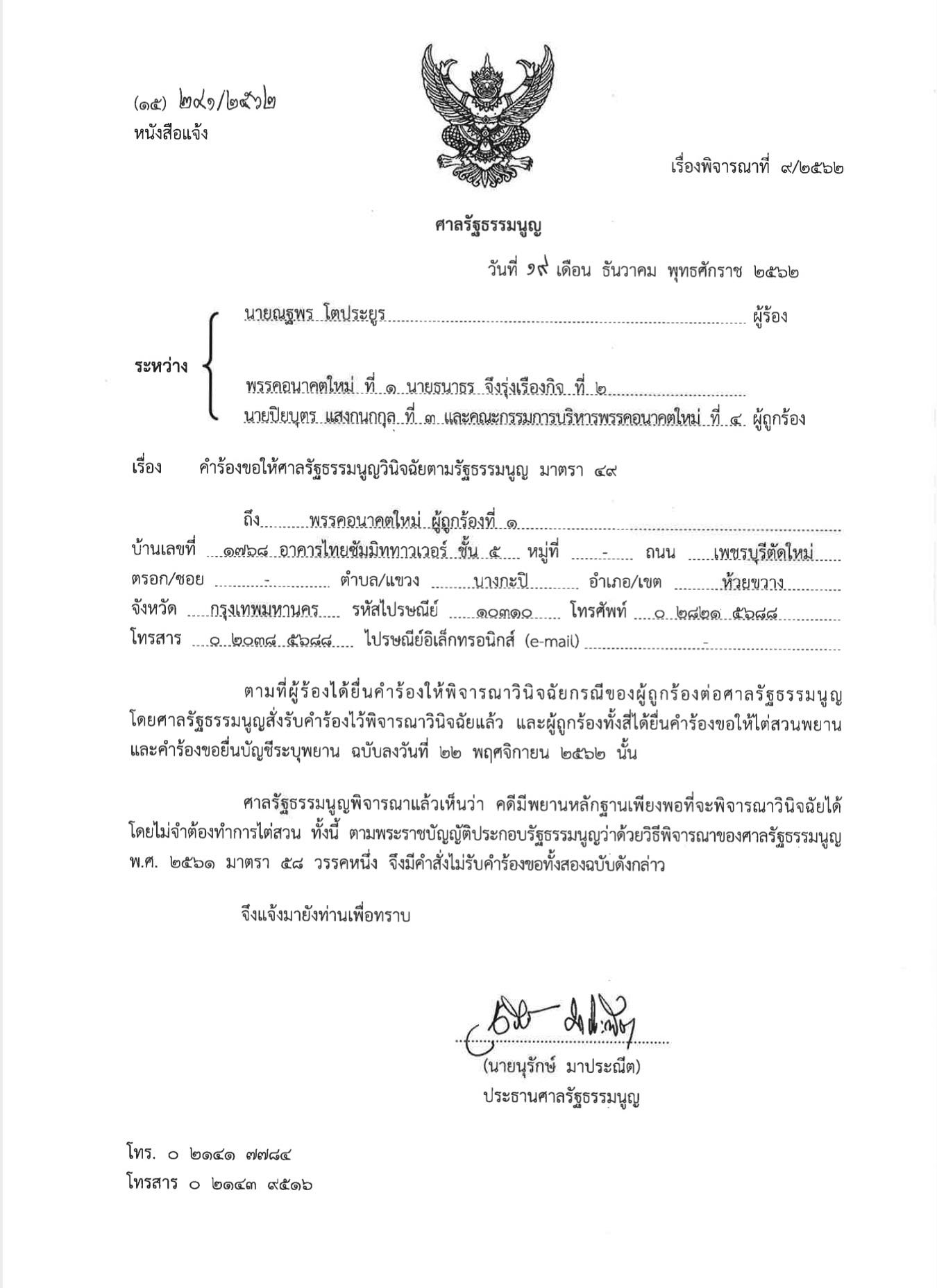 จากกรณีเมื่อวันที่ 19 ก.ค. 2562 ศาลรัฐธรรมนูญมีมติรับคำร้องที่นายณฐพร โตประยูร ยื่นคำร้องขอให้ศาลรัฐธรรมนูญวินิจฉัยว่า พรรคอนาคตใหม่ ผู้ถูกร้องที่ 1 นายธนาธร จึงรุ่งเรืองกิจ ผู้ถูกร้องที่ 2 นายปิยบุตร แสงกนกกุล ผู้ถูกร้องที่ 3 และคณะกรรมการบริหารพรรคอนาคตใหม่ ผู้ถูกร้องที่ 4 มีการกระทำที่เป็นการใช้สิทธิหรือเสรีภาพเพื่อล้มล้างการปกครองระบอบประชาธิปไตยอันมีพระมหากษัตริย์ทรงเป็นประมุขหรือไม่ ตามรัฐธรรมนูญมาตรา 49 นั้น (อ่านประกอบ : ศาล รธน.รับคำร้องไว้วินิจฉัย ปม'บิ๊กตู่'ขาดคุณสมบัติ-'ธนาธร-อนค.'ล้มล้างการปกครองฯ)