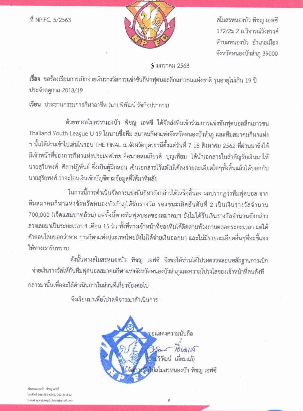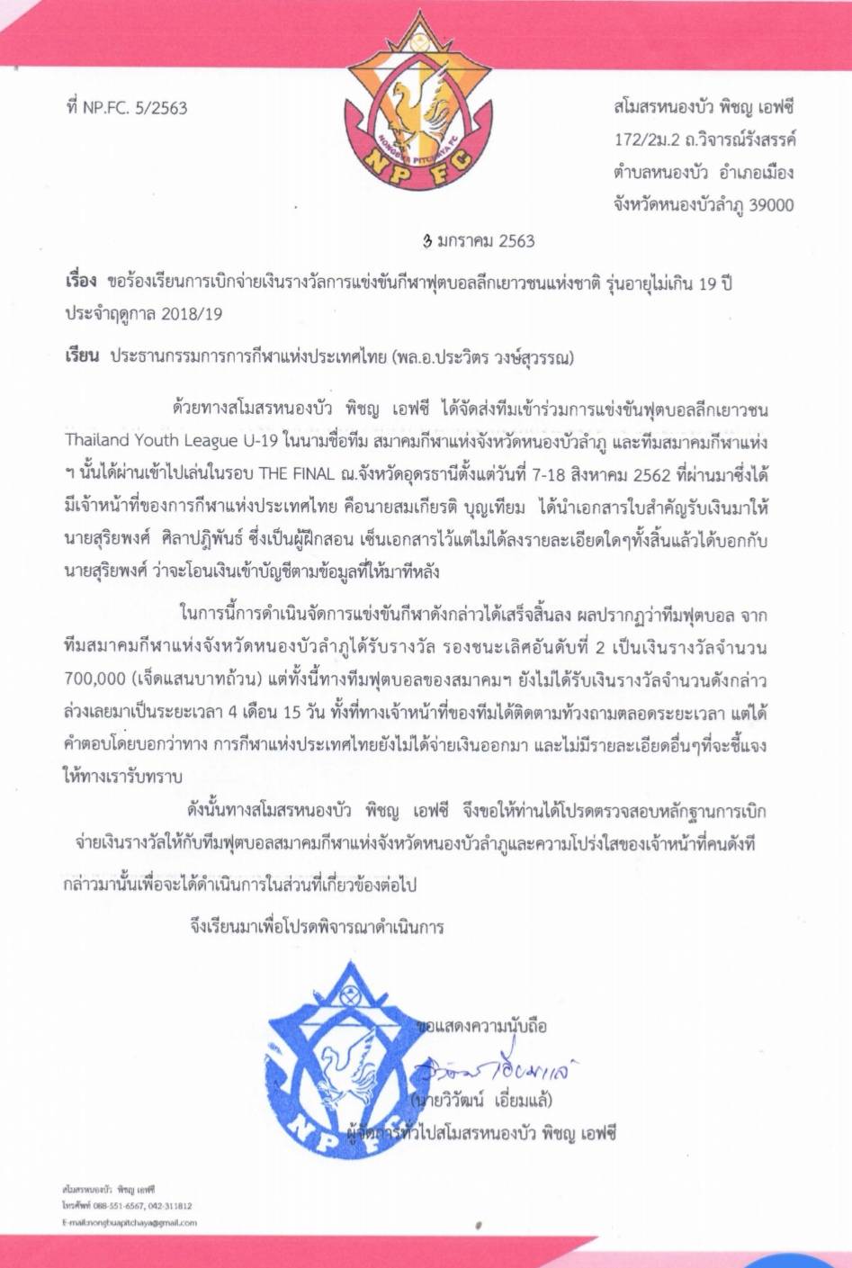 ดังนั้นทางสโมสรหนองบัว พิชญ เอฟซี จึงขอให้ท่านได้โปรดตรวจสอบหลักฐานการเบิก จ่ายเงินรางวัลให้กับทีมฟุตบอลสมาคมกีฬาแห่งจังหวัดหนองบัวลําภูและความโปร่งใสของเจ้าหน้าที่คนดังที่ กล่าวมานั้นเพื่อจะได้ดําเนินการในส่วนที่เกี่ยวข้องต่อไป” (ดูเอกสารประกอบ)