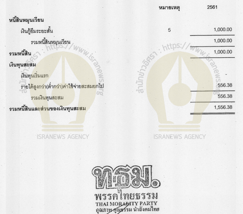 3.พรรคไทยธรรม แจ้งในหมายเหตุงบการเงินมีหนี้สินหมุนเวียน เป็นเงินกู้ยืมระยะสั้น 1,000 บาท โดยระบุว่า เป็นเงินกู้ยืมจากหัวหน้าพรรค และพรรคกู้ยืมเงินจากหัวหน้าพรรคโดยไม่มีการคิดดอกเบี้ยและไม่มีการทำสัญญา