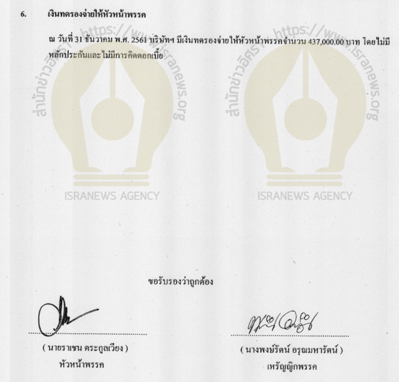 6.พรรคทางเลือกใหม่ แจ้งในหมายเหตุงบการเงินมีหนี้สินหมุนเวียน เป็นเงินทดรองจ่ายให้หัวหน้าพรรค 437,000 บาท โดยระบุว่า ณ วันที่ 31 ธ.ค. 2561 บริษัทฯ มีเงินทดรองจ่ายให้หัวหน้าพรรคจำนวน 437,000 บาท โดยไม่มีหลักประกันและไม่มีการคิดดอกเบี้ย