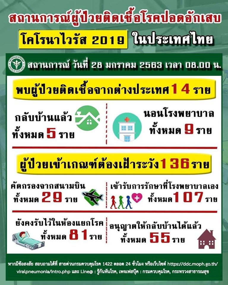 ล่าสุดบ่ายวันเดียวกัน กระทรวงสาธารณสุขของไทย แถลงความคืบหน้า สถานการณ์ โรคปอดติดเชื้อไวรัสโคโรนา สายพันธุ์ใหม่ 2019 ณ สำนักงานปลัดกระทรวงสาธารณสุข พบผู้ป่วยใหม่เพิ่มอีก 6 ราย จากเดิม 8 ราย ซึ่งเป็นคนจีนที่เดินทางมาจากหูเป่ย์ และเป็นครอบครัวเดียวกัน