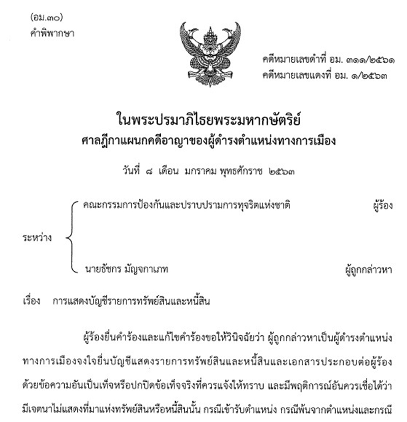 พิพากษาว่า นายธัชกร มัญจกาเภท ผู้ถูกกล่าวหา จงใจยื่นบัญชีแสดงรายการทรัพย์สินและหนี้สินและเอกสารประกอบต่อคณะกรรมการ ป.ป.ช. ด้วยข้อความอันเป็นเท็จหรือปกปิดข้อเท็จจริงที่ควรแจ้งให้ทราบกรณีพ้นจากตําแหน่งรองนายกเทศมนตรีตําบลกังแอน อ.ปราสาท จ.สุรินทร์ และกรณีเข้ารับตําแหน่งนายก อบต.กังแอน ตามพระราชบัญญัติประกอบรัฐธรรมนูญว่าด้วยการป้องกันและปราบปรามการทุจริต พ.ศ. 2542 มาตรา 32 และมาตรา 33 ให้ผู้ถูกกล่าวหาพ้นจากตําแหน่งนายกองค์การ บริหารส่วนตําบลกังแอน ที่ดํารงอยู่ในปัจจุบันตั้งแต่วันที่ 22 เมษายน 2562 ซึ่งเป็นวันที่ศาลฎีกา แผนกคดีอาญาของผู้ดํารงตําแหน่งทางการเมืองมีคําสั่งให้ผู้ถูกกล่าวหาหยุดปฏิบัติหน้าที่ ตามพระราชบัญญัติประกอบรัฐธรรมนูญว่าด้วยวิธีพิจารณาคดีอาญาของผู้ดํารงตําแหน่งทางการเมือง พ.ศ. 2560 มาตรา 17 วรรคสอง และห้ามมิให้ผู้ถูกกล่าวหาดํารงตําแหน่งทางการเมืองหรือดํารงตําแหน่งใดในพรรคการเมืองเป็นเวลาห้าปีนับแต่วันที่ 8 มกราคม 2563 ซึ่งเป็นวันที่ศาลฎีกาแผนกคดีอาญาของผู้ดํารงตําแหน่งทางการเมืองวินิจฉัย ตามพระราชบัญญัติประกอบรัฐธรรมนูญว่าด้วยการป้องกันและปราบปรามการทุจริต พ.ศ. 2542 มาตรา 34 วรรคหนึ่ง กับมีความผิดตามพระราชบัญญัติประกอบรัฐธรรมนูญว่าด้วยการป้องกันและปราบปรามการทุจริต พ.ศ. 2542 มาตรา 119 ฐานจงใจยื่นบัญชีแสดงรายการทรัพย์สินและหนี้สินและเอกสารประกอบต่อคณะกรรมการ ป.ป.ช. ด้วยข้อความอันเป็นเท็จหรือปกปิดข้อเท็จจริงที่ควรแจ้งให้ทราบ กรณีพ้นจากตําแหน่งรองนายกเทศมนตรีตําบลกังแอน และกรณีเข้ารับตําแหน่งนายกองค์การบริหารส่วนตําบลกังแอน การกระทําของผู้ถูกกล่าวหาเป็นความผิดหลายกรรมต่างกัน ให้ลงโทษทุกกรรมเป็นกระทง ความผิดไป ตามประมวลกฎหมายอาญามาตรา 91 จําคุกกระทงละ 2 เดือน และปรับกระทงละ 8,000 บาท รวม 2 กระทง เป็นจําคุก 4 เดือนและปรับ 16,000 บาท ผู้ถูกกล่าวหาให้การ รับสารภาพ เป็นประโยชน์แก่การพิจารณา มีเหตุบรรเทาโทษ ลดโทษให้กึ่งหนึ่งตามประมวลกฎหมายอาญา มาตรา 78 คงจําคุก 2 เดือน และปรับ 8,000 บาท ไม่ปรากฏว่าผู้ถูกกล่าวหาเคยได้รับโทษจําคุกมาก่อน โทษจําคุกจึงให้รอการลงโทษไว้มีกําหนด 1 ปี ตามประมวลกฎหมายอาญา มาตรา 56 ไม่ชําระค่าปรับให้จัดการตามประมวลกฎหมายอาญา มาตรา 29, 30 คําขออื่นนอกจากนี้ให้ยก (คดีหมายเลขแดงที่ อม. 1/2563 วันที่ 8 ม.ค.2563)