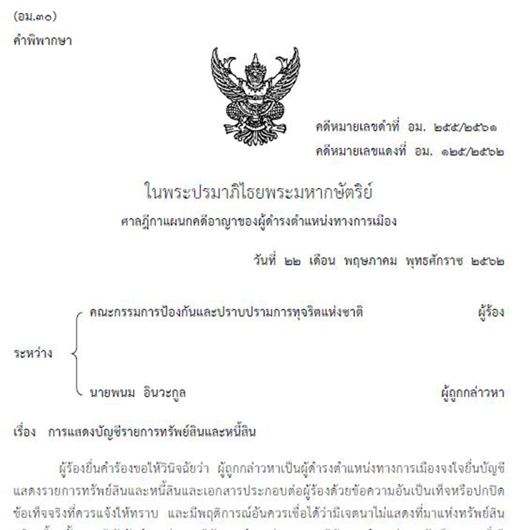 พิพากษาว่า นายพนม อินวะกูล ผู้ถูกกล่าวหาจงใจยื่นบัญชีแสดงรายการทรัพย์สินและหนี้สินและเอกสารประกอบต่อผู้ร้องด้วยข้อความอันเป็นเท็จหรือปกปิดข้อเท็จจริงที่ควรแจ้งให้ทราบกรณีเข้ารับตำแหน่งและกรณีพ้นจากตำแหน่งนายกองค์การบริหารส่วนตำบลบ้านจ่า อำเภอบางระจัน จังหวัดสิงห์บุรี ตามพระราชบัญญัติประกอบรัฐธรรมนูญว่าด้วยการป้องกันและปราบปรามการทุจริต พ.ศ. 2542 มาตรา 32 และมาตรา 33 ห้ามมิให้ผู้ถูกกล่าวหาดำรงตำแหน่งทางการเมืองหรือดำรงตำแหน่งใดในพรรคการเมืองเป็นเวลาห้าปีนับแต่วันที่ 6 กันยายน 2556 ซึ่งเป็นวันที่ผู้ถูกกล่าวหาพ้นจากตำแหน่ง ตามพระราชบัญญัติประกอบรัฐธรรมนูญว่าด้วยการป้องกันและปราบปรามการทุจริต พ.ศ. 2542 มาตรา 34 วรรคสอง กับมีความผิดตามพระราชบัญญัติประกอบรัฐธรรมนูญว่าด้วยการป้องกันและปราบปรามการทุจริต พ.ศ. 2542 มาตรา 119 ฐานเป็นเจ้าหน้าที่ของรัฐจงใจยื่นบัญชีแสดงรายการทรัพย์สินและหนี้สินและเอกสารประกอบต่อผู้ร้องด้วยข้อความอันเป็นเท็จหรือปกปิดข้อเท็จจริงที่ควรแจ้งให้ทราบกรณีพ้นจากตำแหน่ง จำคุก 2 เดือน และปรับ 8,000 บาท ผู้ถูกกล่าวหาให้การรับสารภาพ เป็นประโยชน์แก่การพิจารณา มีเหตุบรรเทาโทษ ลดโทษให้กึ่งหนึ่งตามประมวลกฎหมายอาญา มาตรา 78 คงจำคุก 1 เดือน และปรับ 4,000 บาท ไม่ปรากฏว่าผู้ถูกกล่าวหาเคยได้รับโทษจำคุกมาก่อน โทษจำคุกจึงให้รอการลงโทษไว้มีกำหนด 1 ปี ข้อหาและคำขออื่นนอกจากนี้ให้ยก. (คดีหมายเลขแดงที่ อม. 125/2562 วันที่ 22 พ.ค.2562)