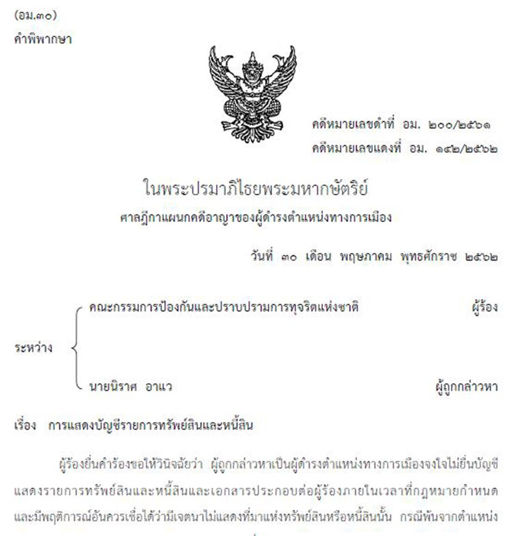 พิพากษาว่า นายนิราศ อาแว ผู้ถูกกล่าวหาจงใจไม่ยื่นบัญชีแสดงรายการทรัพย์สินและหนี้สินและเอกสารประกอบต่อผู้ร้องภายในเวลาที่กฎหมายกำหนด กรณีพ้นจากตำแหน่งนายกองค์การบริหารส่วนตำบลแหลมโพธิ์ อำเภอยะหริ่ง จังหวัดปัตตานี ตามพระราชบัญญัติประกอบรัฐธรรมนูญว่าด้วยการป้องกันและปราบปรามการทุจริต พ.ศ. 2542 มาตรา 32 และมาตรา 33 ห้ามมิให้ผู้ถูกกล่าวหาดำรงตำแหน่งทางการเมืองหรือดำรงตำแหน่งใดในพรรคการเมืองเป็นเวลาห้าปีนับแต่วันที่ 6 กันยายน 2556 ซึ่งเป็นวันที่ผู้ถูกกล่าวหาพ้นจากตำแหน่ง กับมีความผิดตามพระราชบัญญัติประกอบรัฐธรรมนูญว่าด้วยการป้องกันและปราบปรามการทุจริต พ.ศ. 2542 มาตรา 119 ฐานเป็นเจ้าหน้าที่ของรัฐจงใจไม่ยื่นบัญชีแสดงรายการทรัพย์สินและหนี้สินและเอกสารประกอบต่อผู้ร้องภายในเวลาที่กฎหมายกำหนดกรณีพ้นจากตำแหน่ง จำคุก 2 เดือน และปรับ 8,000 บาท ผู้ถูกกล่าวหาให้การรับสารภาพเป็นประโยชน์แก่การพิจารณา มีเหตุบรรเทาโทษ ลดโทษให้กึ่งหนึ่ง คงจำคุก 1 เดือน และปรับ 4,000 บาท โทษจำคุกให้รอการลงโทษ 1 ปี คำขอและข้อหาอื่นนอกจากนี้ให้ยก. (คดีหมายเลขแดงที่ อม. 142/2562 วันที่ 30 พ.ค.2562)